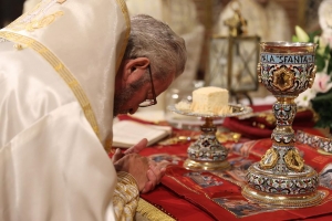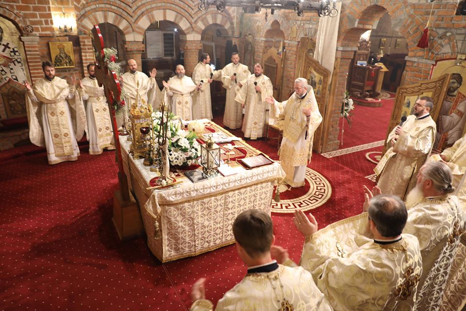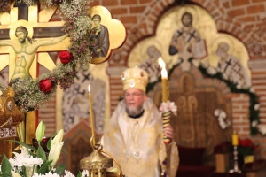 Sâmbătă noaptea, Preasfințitul Părinte Iustin, Episcopul Maramureșului și Sătmarului, a oficiat, la Catedrala Episcopală „Sfânta Treime” din Baia Mare, în continuarea Slujbei Învierii Domnului, Sfânta Liturghie solemnă din ziua de Paști, în fruntea unui sobor alcătuit din preoții și diaconii Catedralei. Răspunsurile la Sfânta Liturghie au fost date de arhidiaconii, diaconii și teologii de la strana Catedralei.