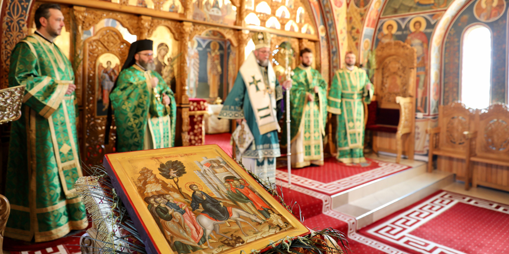 PS Iustin: „Să-i dăm ramurile recunoștinței și să așternem hainele rugăciunii și ale credinței înaintea Mântuitorului, care intră astăzi în fiecare biserică, chiar dacă-i goală, în fiecare Altar, dar și în fiecare casă” (GALERIE FOTO)