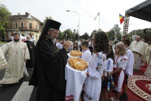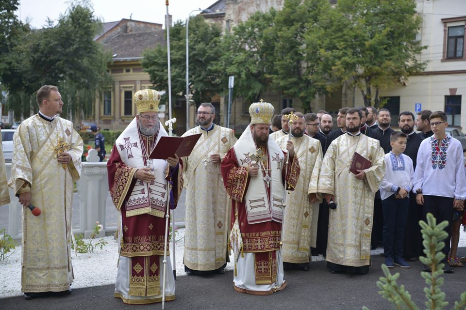 Spre slujirea Sfintei Liturghii, în generosul spațiu al Altarului deschis, din fața bisericii, cei doi ierarhi au fost însoțiți de un ales sobor de preoți și diaconi. Îi amintim pe Pr. Ioan Socolan, protopopul de Satu Mare, Pr. Marcel Malanca, protopopul de Oaș, Pr. Dr. Cristian Vasile Boloș, parohul bisericii, Pr. Radu Șimonca, preot II, Arhid. Teodosie Bud, consilier eparhial, Arhid. Ionuț Todorca, secretar eparhial, Arhid. Gherasim Nap, secretar eparhial, Arhid. Vlad Verdeș, inspector eparhial, Arhid. Dr. Nifon Motogna, administratorul Catedralei Episcopale „Sfânta Treime” din Baia Mare. Răspunsurile liturgice au fost date de același excepțional grup psaltic „Theologos”, condus de Arhid. Prof. Drd. Adrian Dobreanu, iar priceasna i-a aparținut foarte tinerei, dar și foarte cunoscutei soliste Iulia Ioana Vlad.