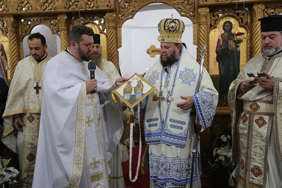 La final, părintele Bociorec Vasile Ionel a mulțumit ierarhului pentru prezența în mijlocul credincioșilor și, în semn de recunoștință și prețuire, a oferit PreasfințieinSale o bederniță brodată cu chipurile celor doi sfinți amintiți, ocrotitori ai lăcașului de închinare, informează Pr. Adrian Dobreanu.