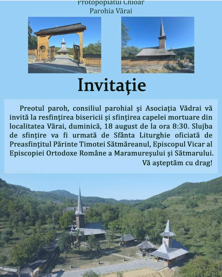 Duminică, 18 august, începând cu ora 8.30 va avea loc resfințirea bisericii și sfințirea capelei mortuare din satul Vărai. După slujba de sfințire va urma Sfânta Liturghie care va fi oficiată de Preasfințitul Părinte Timotei Sătmăreanul, Episcopul Vicar al Episcopiei Ortodoxe Române a Maramureșului și Sătmarului.