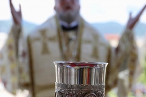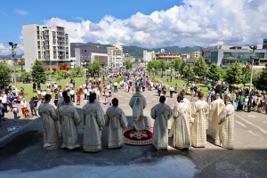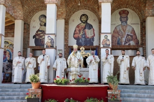 Episcopul a slujit Sfânta Liturghie pe esplanada Catedralei, înconjurat de un ales sobor de preoți și diaconi.