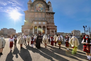 În interiorul Catedralei credincioşii au păstrat distanţarea impusă de reglementările anticovid, iar cei care nu au avut loc în interior au rămas în exteriorul sfântului locaş.