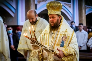 Luni, 3 mai, a doua zi de Paşti, Preasfinţitul Părinte Timotei Sătmăreanul, Arhiereu vicar al Episcopiei Maramureșului și Sătmarului, a oficiat Sfânta Liturghie la Catedrala Istorică „Adormirea Maicii Domnului” din Baia Mare, în fruntea unui sobor de preoţi şi diaconi.