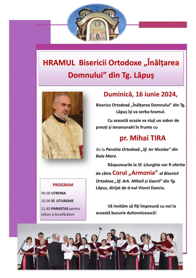 Duminică, 16 iunie, biserica ortodoxă „Înălțarea Domnului” din Târgu Lăpuș (preot protopop Florin Stan) își va serba hramul. Sunteți invitați să luați parte și dumneavoastră la această bucurie duhovnicească!