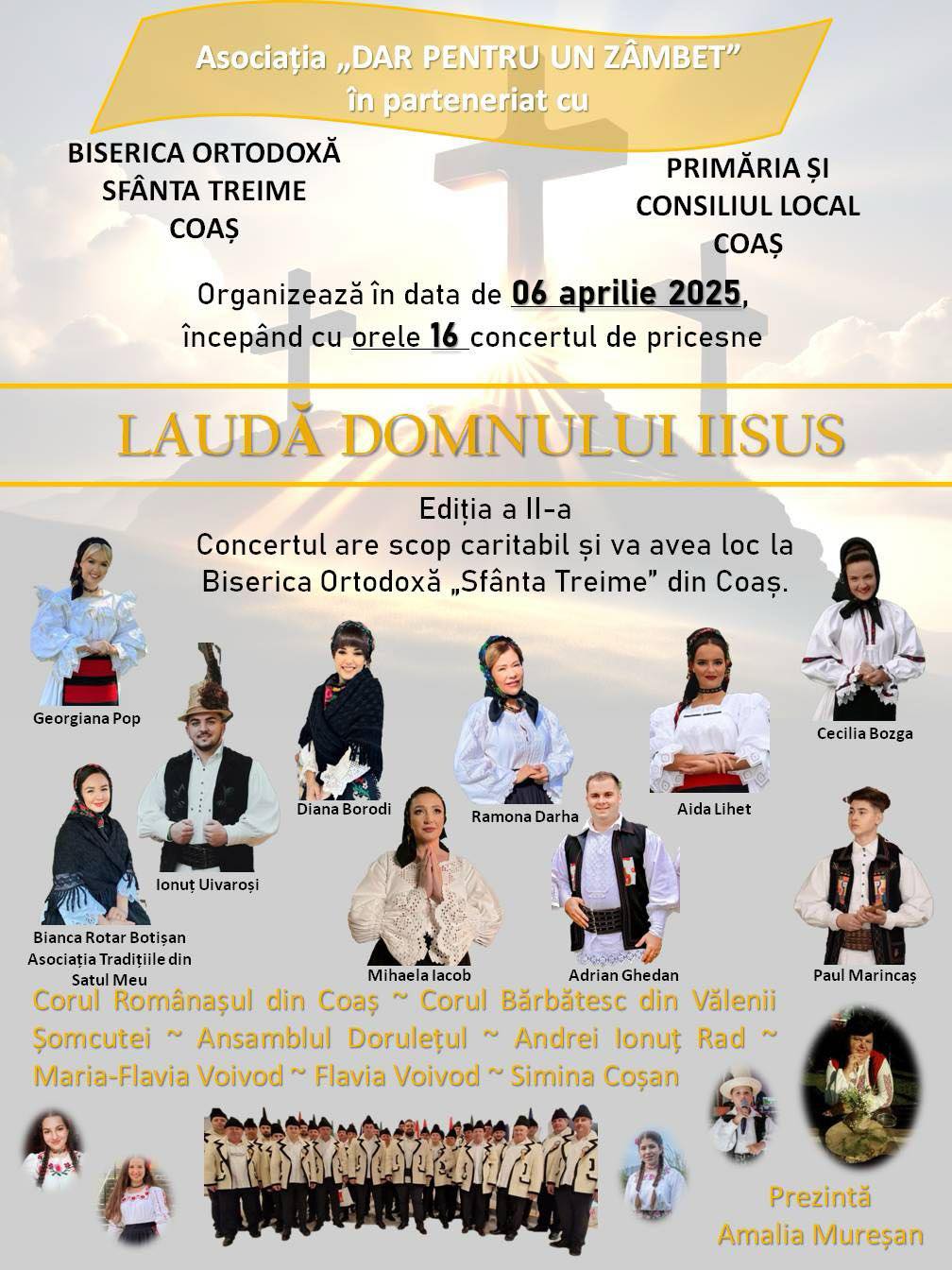 „Cu împlinire și bucurie în suflete, Asociația Dar pentru Un Zâmbet vă invită la cea de a doua ediție a concertului de pricesne “Laudă Domnului IIsus”, în scop caritabil, în data de 6 aprilie 2025, de la ora 16:00. Concertul va avea loc la Biserica Ortodoxă “Sfânta Treime” din Coaș, cu sprijinul Primăriei și al Consiliului local al comunei Coaș.