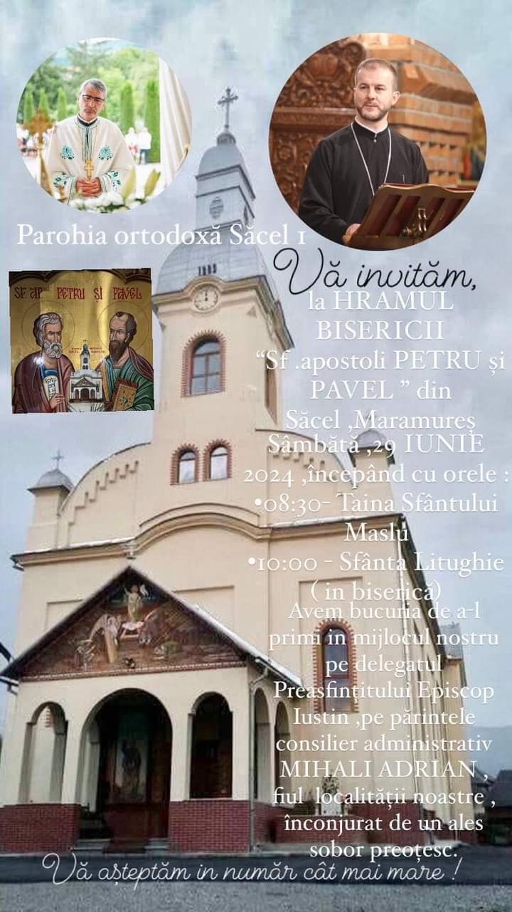 Sâmbătă, 29 iunie, va fi hramul bisericii „Sfinții Apostoli Petru și Pavel” din localitatea maramureșeană Săcel (pr. paroh Dumitru Iuga).