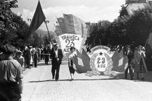 Actul de la 23 august 1944 a fost însă sărbătorit chiar din anul următor, fapt reflecat în presa vremii, amintind aici ziarul “Democratul”, ce prezenta modul de organizare a sărbătorii: munca câmpului, munca din ateliere, magazine, fabrici şi birouri va fi suspendată. În fiecare sat, alături de steagul României democrate, casele vor fi împodobite cu steagul roşu, simbolul libertăţii. În toate bisericile se va oficia Te-Deum care va fi urmat de manifestaţii populare şi petreceri organizate în comun pentru toate neamurile conlocuitoare”.