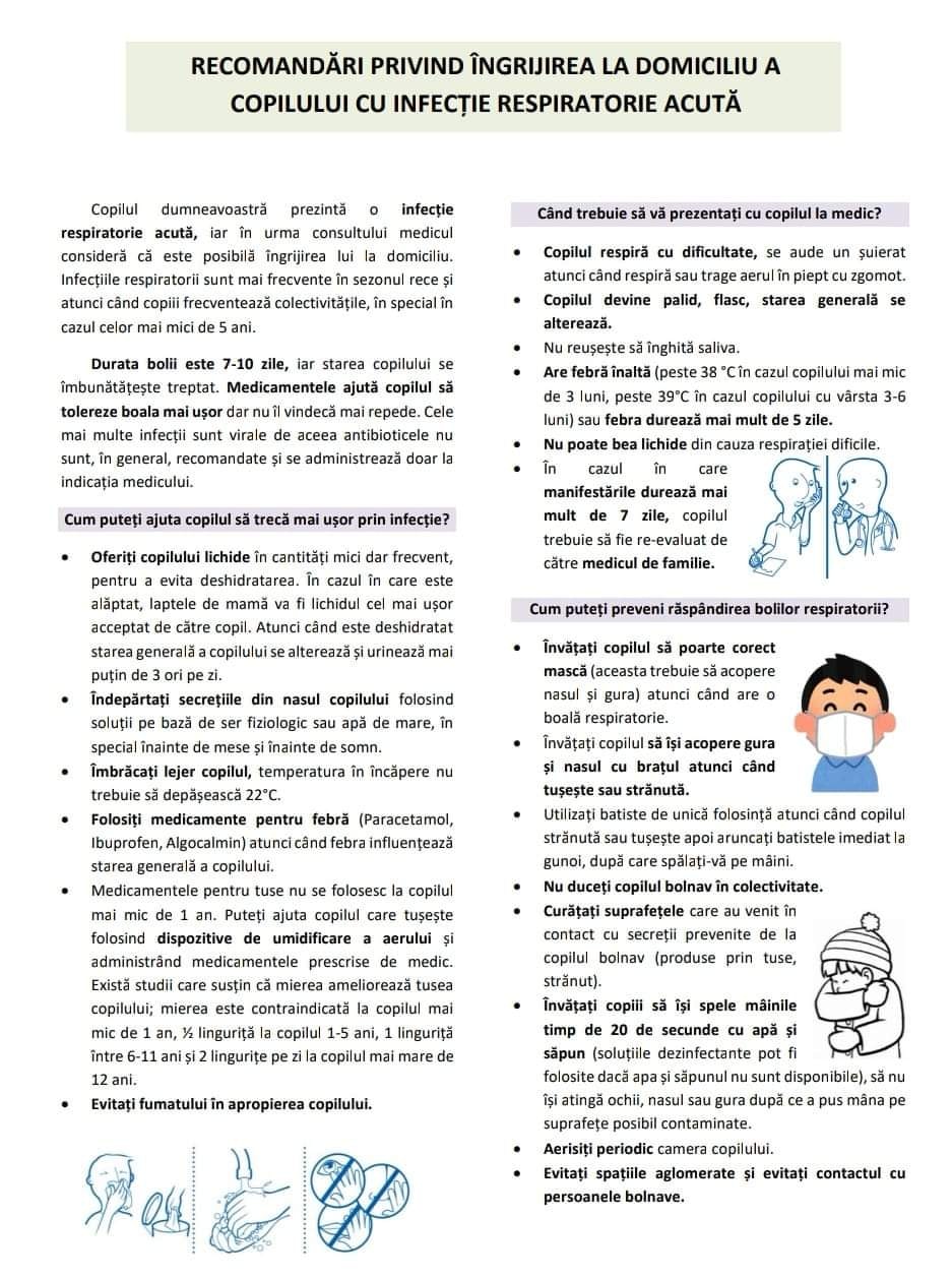 Așadar, cel mai bine este să vă adresați medicului de familie de la primele simptome și să încercați să vă protejați, dar este foarte important să nu apelați la automedicație. Mai ales în cazul copiilor. „Stop antibiotic! Rog mai ales părinții să nu mai administreze copiilor din proprie inițiativă antibiotice. Antibioticul nu se dă preventiv, nu se administrează pentru scăderea febrei și nu tratează virozele. Antibioticul distruge flora bacteriană obișnuită din organism, scade imunitatea antivirală și are recomandare limitată. Așa că, lăsați medicul să decidă când și cum trebuie administrat”, arată Călin Man, medic de familie băimărean. Aveți câteva sfaturi utile în imaginile atașate!