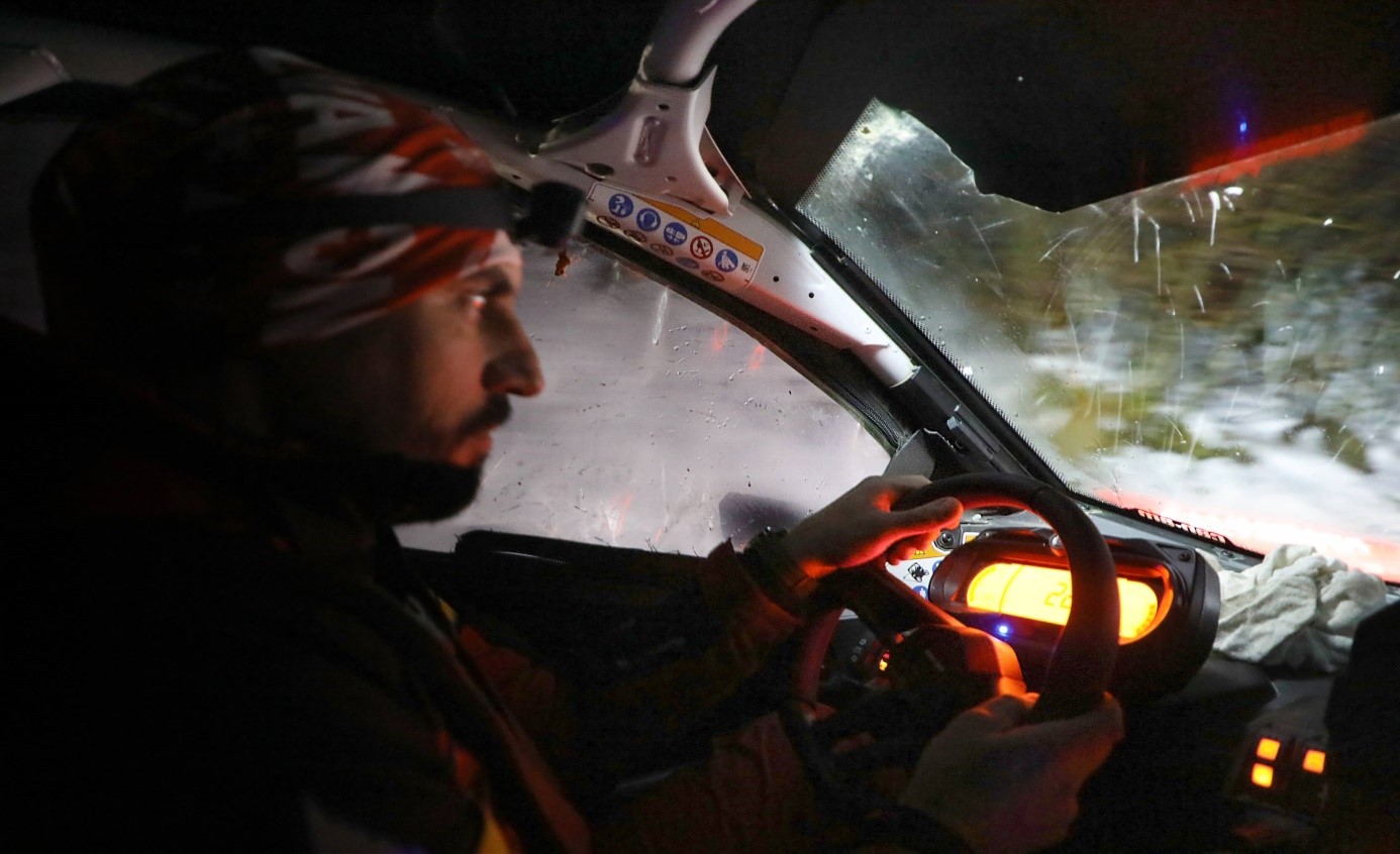 Mihai Cantea, salvator al Salvamont Maramureș, parcurge primii kilometri la bordul unui buggy, înainte de a urca muntele pe jos pentru a căuta dezertori ucraineni aflați în dificultate, în noaptea dintre 24 și 25 ianuarie 2025. (FABIEN MAGNENOU / FRANCEINFO)