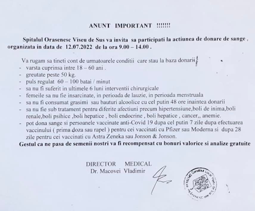 În acest sens, se organizeaz o campanie de donare de sânge. Aceasta va avea loc la Spitalul Orășenesc Vișeu de Sus – data de 12 iulie 2022 – în intervalul orar 09:00-14:00, arată organizatorii.