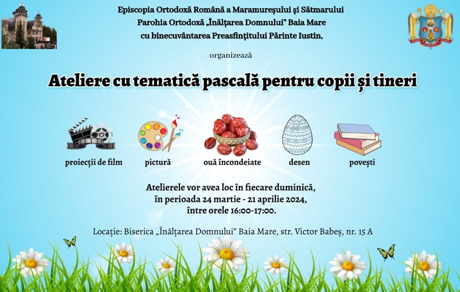 Cu binecuvântarea Preasfințitului Părinte Iustin, Episcopul Maramureșului și Sătmarului, la biserica „Înălțarea Domnului” din Baia Mare (str. Victor Babeș, zona Spitalului TBC) se organizează, în fiecare duminică din Postul Mare, ateliere cu tematică pascală pentru copii și tineri.