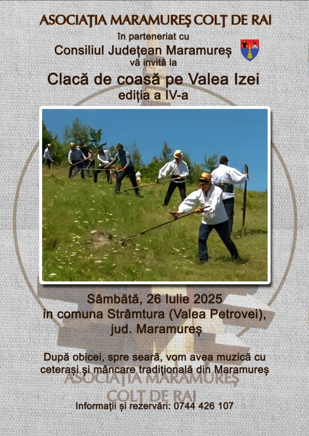 Pentru al patrulea an consecutiv, Asociația ”Maramureș colț de Rai” cu sprijinul Consiliului Județean Maramureș organizează „Clacă de coasă pe Valea Izei”.