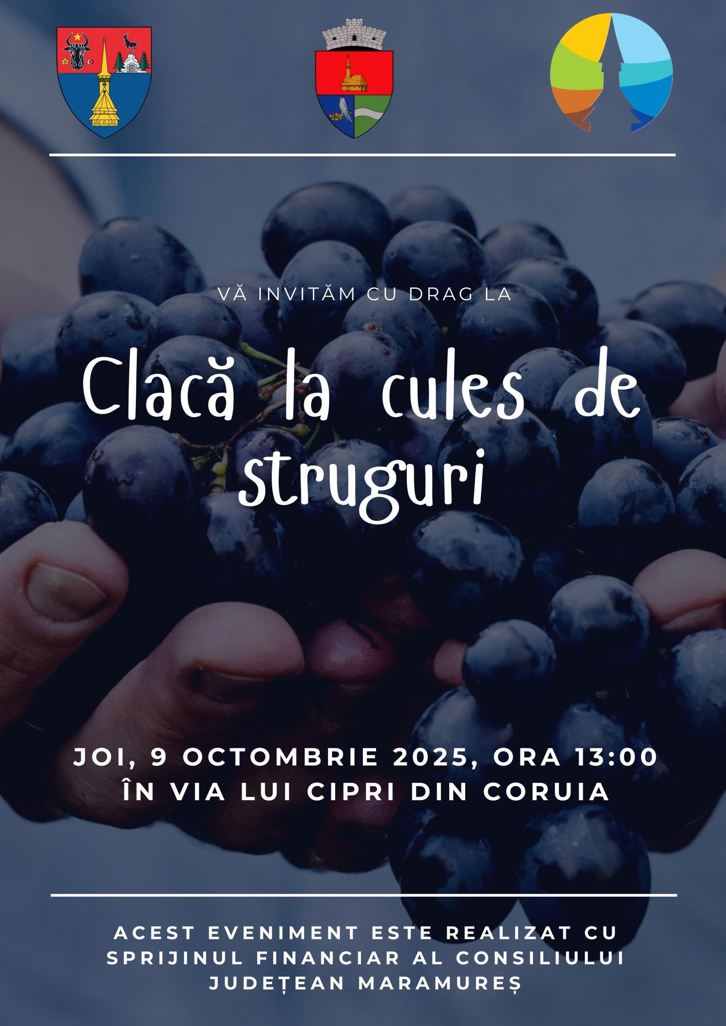 Joi, 9 octombrie, în localitatea Coruia (comuna Săcălășeni) va avea loc „Clacă de cules struguri”. Evenimentul se va desfășura la via lui Cipri, un localnic.