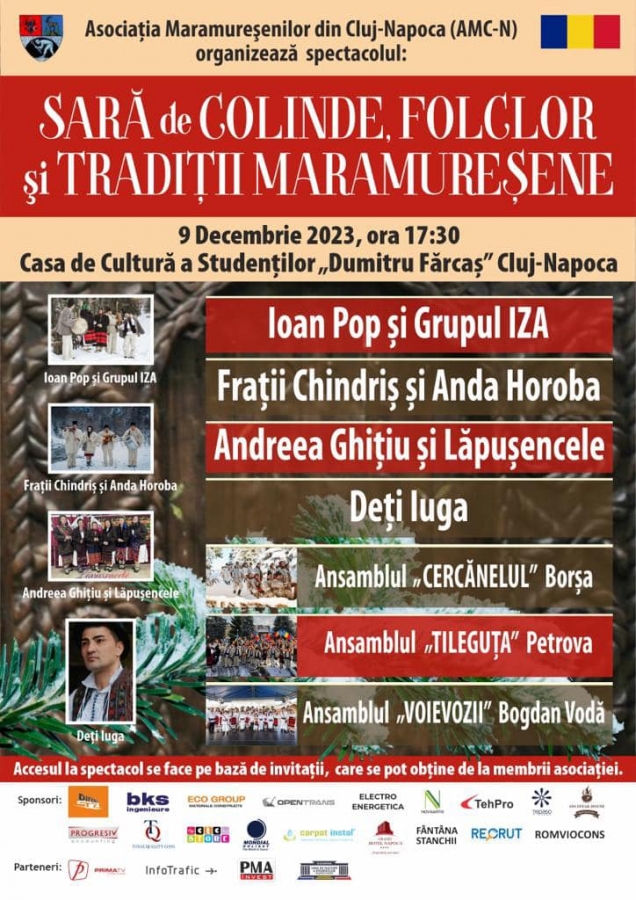 O seară de colinde, folclor și tradiții maramureșene va avea loc pe 9 decembrie, de la ora 17.30, în Cluj-Napoca, locația fiind Casa de Cultură a Studenților „Dumitru Fărcaș”.