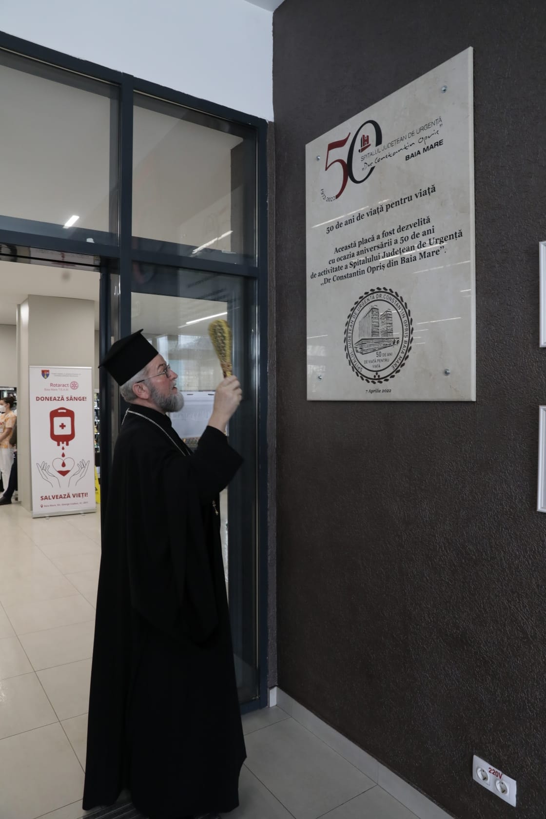 Evenimentul a debutat în holul Spitalului, cu o slujbă de Te-Deum săvârșită de un sobor de preoți, care i-a avut în frunte pe PS Iustin, Episcopul Ortodox al Maramureșului și Sătmarului și PS Vasile Bizău, Episcopul greco-Catolic al Maramureșului. Cu acest prilej, PS Iustin i-a conferit managerului George Alexandru Oros distincția ”Ordinul Crucea Iustinian Arhiepiscopul”, iar colectivului spitalului, Medalia omagială Justinian Arhiepiscopul. Apoi, pentru a marca semicentenarul Spitalului, a fost dezvelită o placă aniversară, amplasată la intrarea în instituție, alături de galeria celor 10 directori care au condus Spitalul Județean de Urgență ”Dr. Constantin Opriș” din Baia Mare de la înființare până în prezent. Evoluția și dezvoltarea Spitalului a fost surprinsă într-o expoziție documentară, care a fost vernisată astăzi și care va putea fi admirată de vizitatori și în zilele următoare.