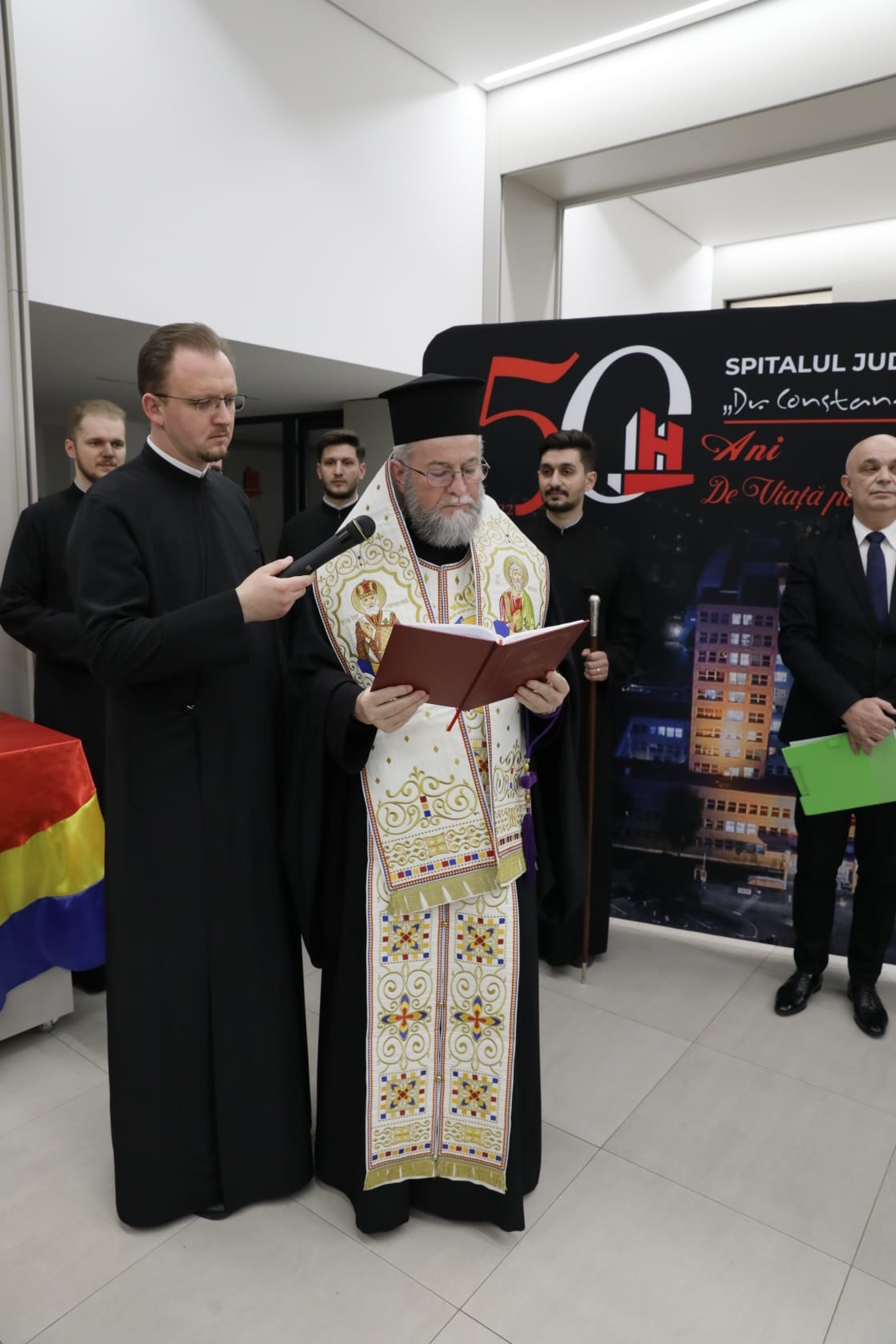 Slujba de binecuvântare a fost oficiată de Preasfințitul Părinte Iustin, urmată de dezvelirea unui plăci aniversare care a fost sfințită de Preasfinția Sa, și de vernisajul unei expoziții documentare care ilustrează istoria de 50 de ani a instituției de sănătate publică. Evenimentul a fost urmat de ședința festivă a Comitetelor directoare ale Spitalului Județean din cei 50 de ani de activitate, la care au luat cuvântul mai multe personalități publice.