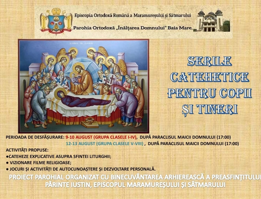 În perioada 9-10 august vor avea loc pentru clasele I-IV, iar în 12-13 august pentru clasele V-VIII. Activităţile se vor desfășura după Paraclisul Maicii Domnului (ora 17.00).