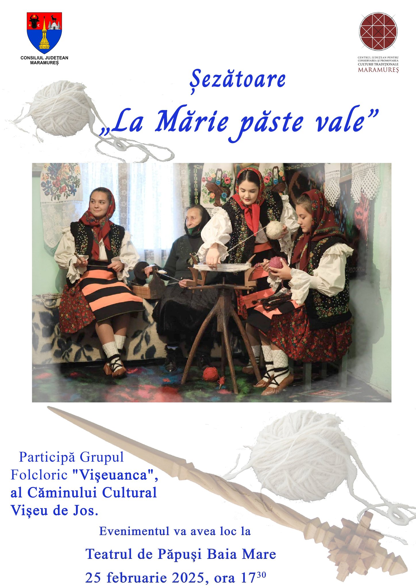 Centrul Județean pentru Conservarea și Promovarea Culturii Tradiționale „Liviu Borlan”, în parteneriat cu Grupul Folcloric „Vișeuanca” al Căminului Cultural din Vișeu de Jos, vă invită să pășiți în lumea de poveste a satului maramureșean, la o șezătoare autentică de pe Valea Vișeului.