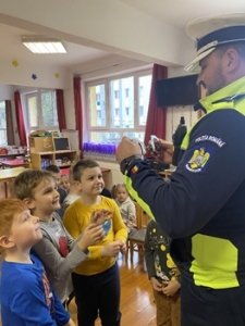 Vineri, un polițist din cadrul Biroului Rutier Baia Mare, împreună cu unul de la Compartimentul de Presă, au fost prezenți în mijlocul copilașilor ai Grădiniței cu program prelungit nr. 25 din Baia Mare.