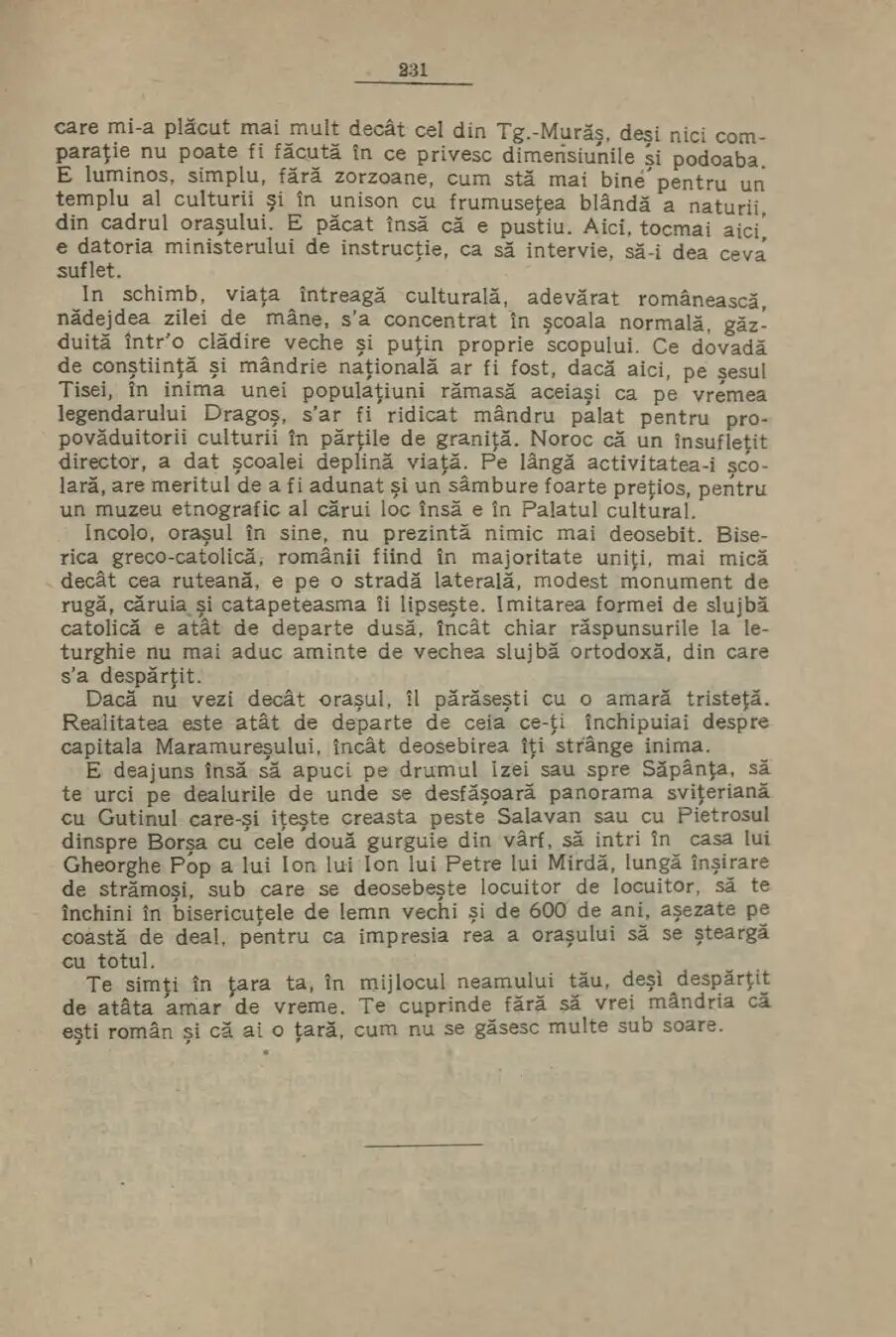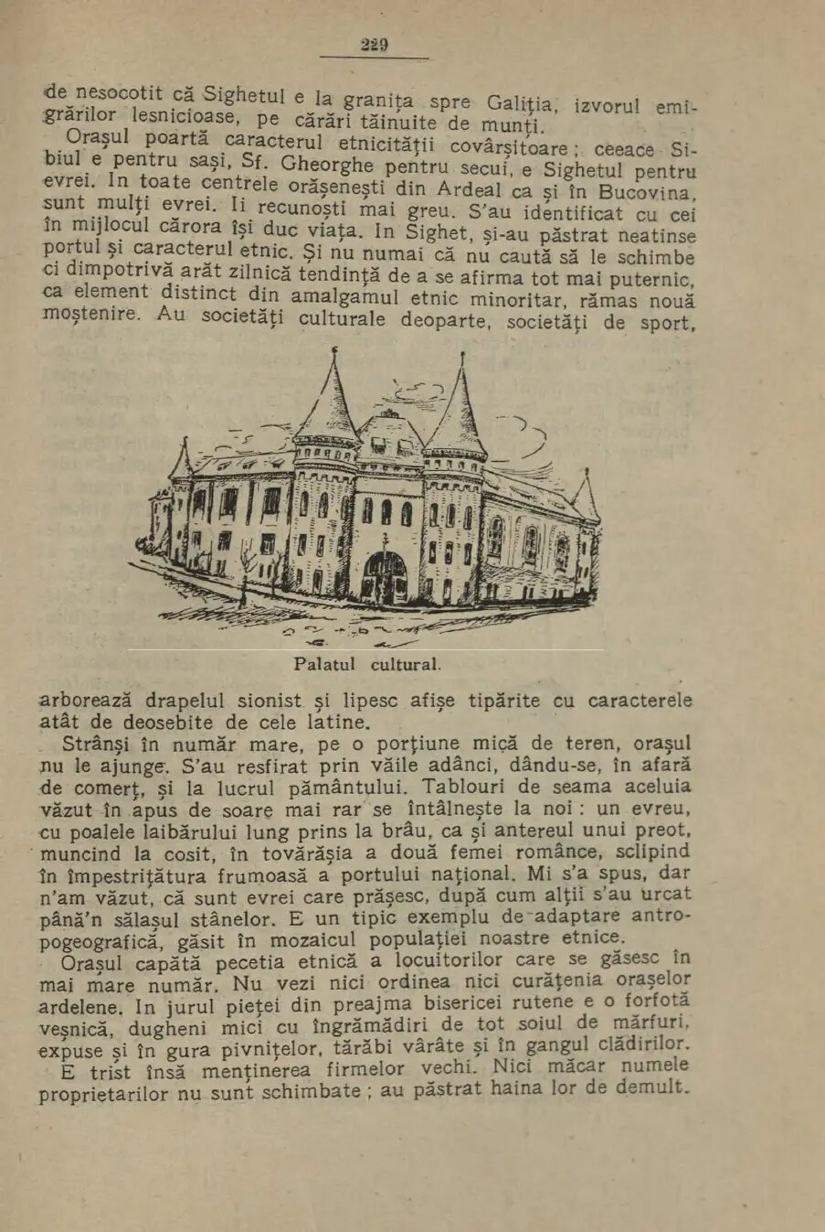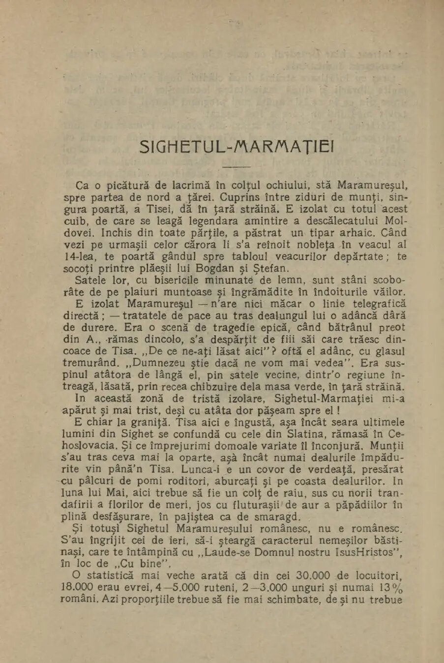 „Satele lor, cu biserici minunate de lemn, sunt stâni scoborâte de pe plaiuri muntoase și îngrămădite în îndoiturile văilor. E izolat Maramureșul, el nu are linie telegrafică directă, tratatele de pace au tras dealungul lui o adâncă dâră de durere. (…) În această zonă de tristă izolare, Sighetul-Marmației mi-a părut și mai trist, deși cu atâta dor pășeam în el! E chiar la graniță. Tisa aici e îngustă, așa încât seara ultimele lumini din Sighet se confundă cu cele din Slatina, rămasă în Cehoslovacia. Și ce împrejurimi variate îl înconjură”, mai arată Ion Simionescu, care mai menționează și statistică a recensământului. „O statistică mai veche arată că din cei 30.000 locuitori, 18.000 erau evrei, 4-5.000 ruteni, 2-3.000 unguri și doar 13% români. Azi proporțiile trebuie să fie mai schimbate, de și nu trebuie de nesocotit că Sighetul e la granița spre Galiția, izvorul emigrărilor lesnicioase, pe cărări tăinuite de munți”, mai arată Ion Simionescu.
