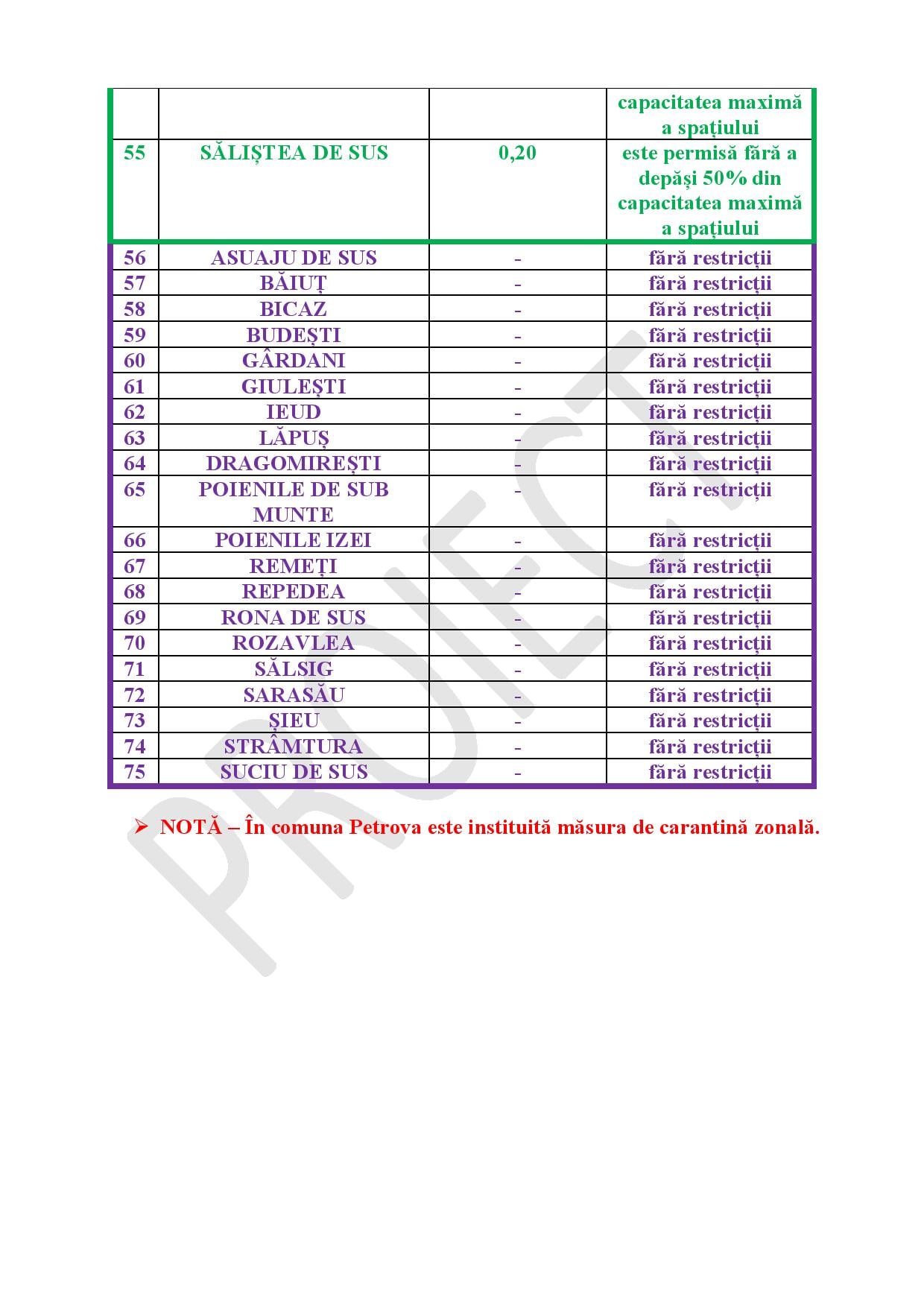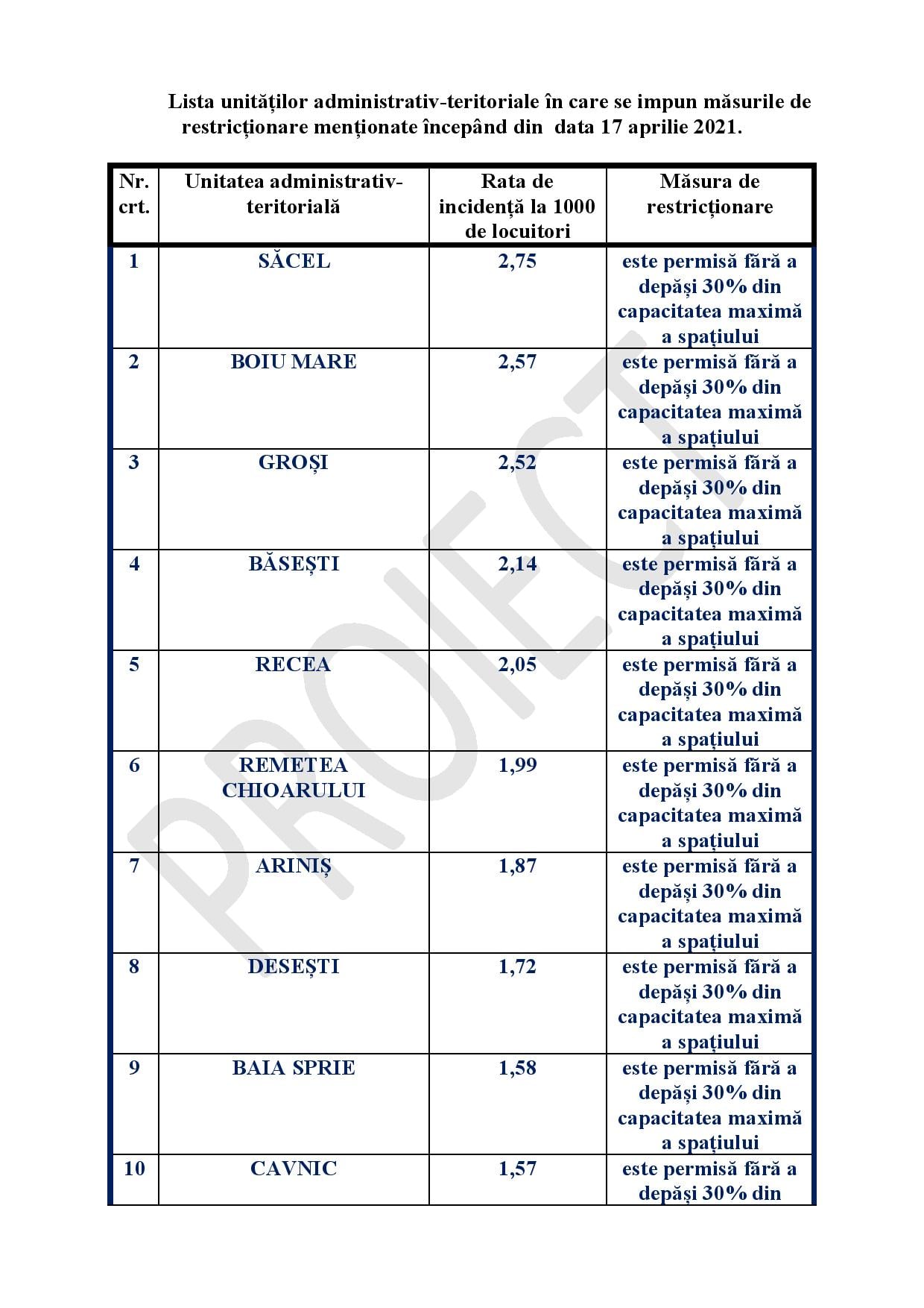 Este cunoscut faptul că una dintre măsuri este închiderea restaurantelor în interior în unitățile administrativ-teritoriale în care incidența cazurilor depășește 3 cazuri de COVID-19 la mia de locuitori. Însă, noile cifrele luate în considerare sunt cele din 16 aprilie (vezi tabelul la finalul materialului). În prezent, în Maramureș, o singură unitate administrativ-teritorială din Maramureș, comuna Petrova, se mai află peste pragul de 3 cazuri de COVID-19 la mia de locuitori.