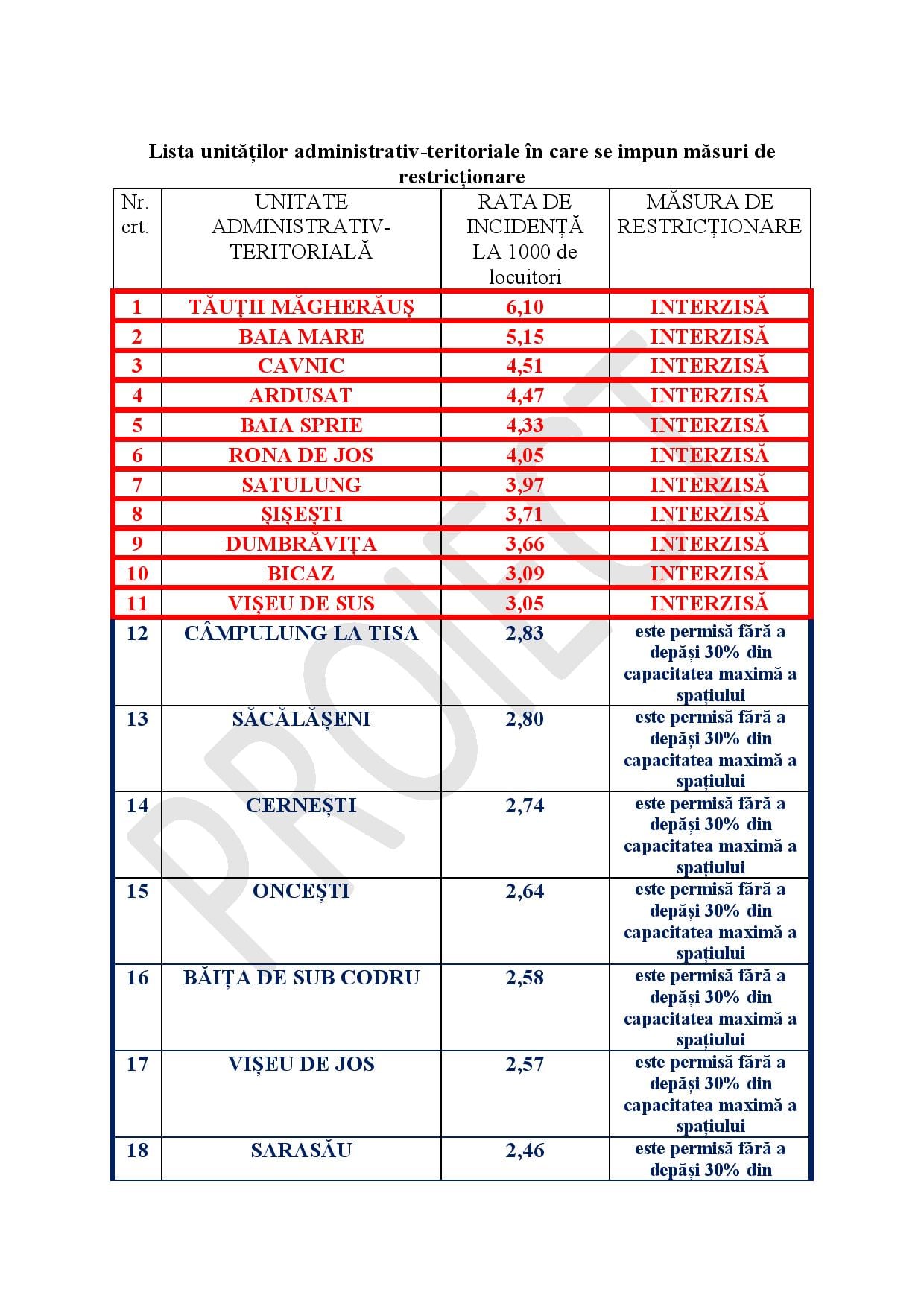 Actualizare a deciziilor luate de Comitetul Județean pentru Situații de Urgență (CJSU) Maramureș la finalul săptămânii trecute, în contextul evoluției situației epidemiologice. Este cunoscut faptul că una dintre măsuri este închiderea restaurantelor în interior în unitățile administrativ-teritoriale în care incidența cazurilor depășește 3 cazuri la mia de locuitori. Însă, noile cifrele luate în considerare sunt cele din 19 februarie (vezi tabelul la finalul materialului). Peste pragul de 3 se află și municipiul Baia Mare, dar nu și municipiul Sighetu Marmației.