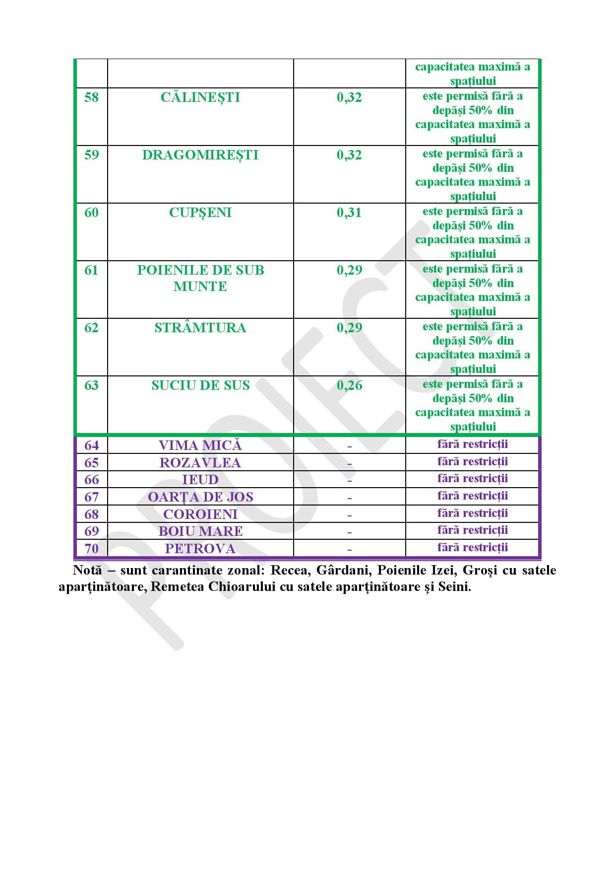 Mai menționăm faptul că lista restricțiilor instituite și lista unităților administrativ-teritoriale (UAT)-uri variază în funcție de contextului epidemiologic actual. Așadar, se pot produce actualizări ori de câte ori va fi nevoie. Măsurile diferă în cele șase localități aflate în carantină zonală. Acolo, măsurile restrictive sunt mult mai dure.