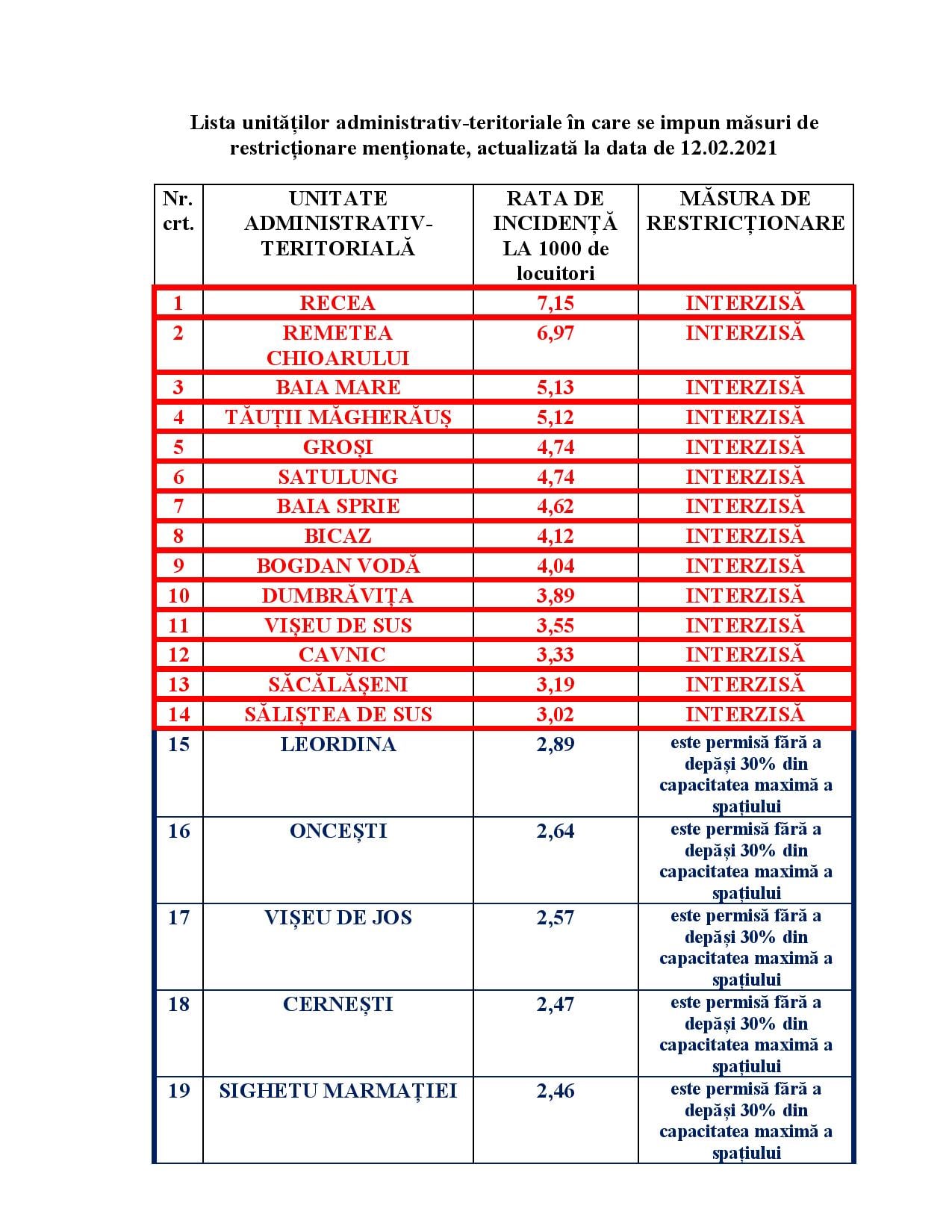 Actualizare a deciziilor luate de Comitetul Județean pentru Situații de Urgență (CJSU) Maramureș la finalul săptămânii trecute, în contextul evoluției situației epidemiologice. Este cunoscut faptul că una dintre măsuri este închiderea restaurantelor în interior în unitățile administrativ-teritoriale în care incidența cazurilor depășește 3 cazuri la mia de locuitori. Însă, noile cifrele luate în considerare sunt cele din 12 februarie (vezi tabelul la finalul materialului). Peste pragul de 3 se află și municipiul Baia Mare, dar nu și municipiul Sighetu Marmației, care a ieșit din scenariul roșu.