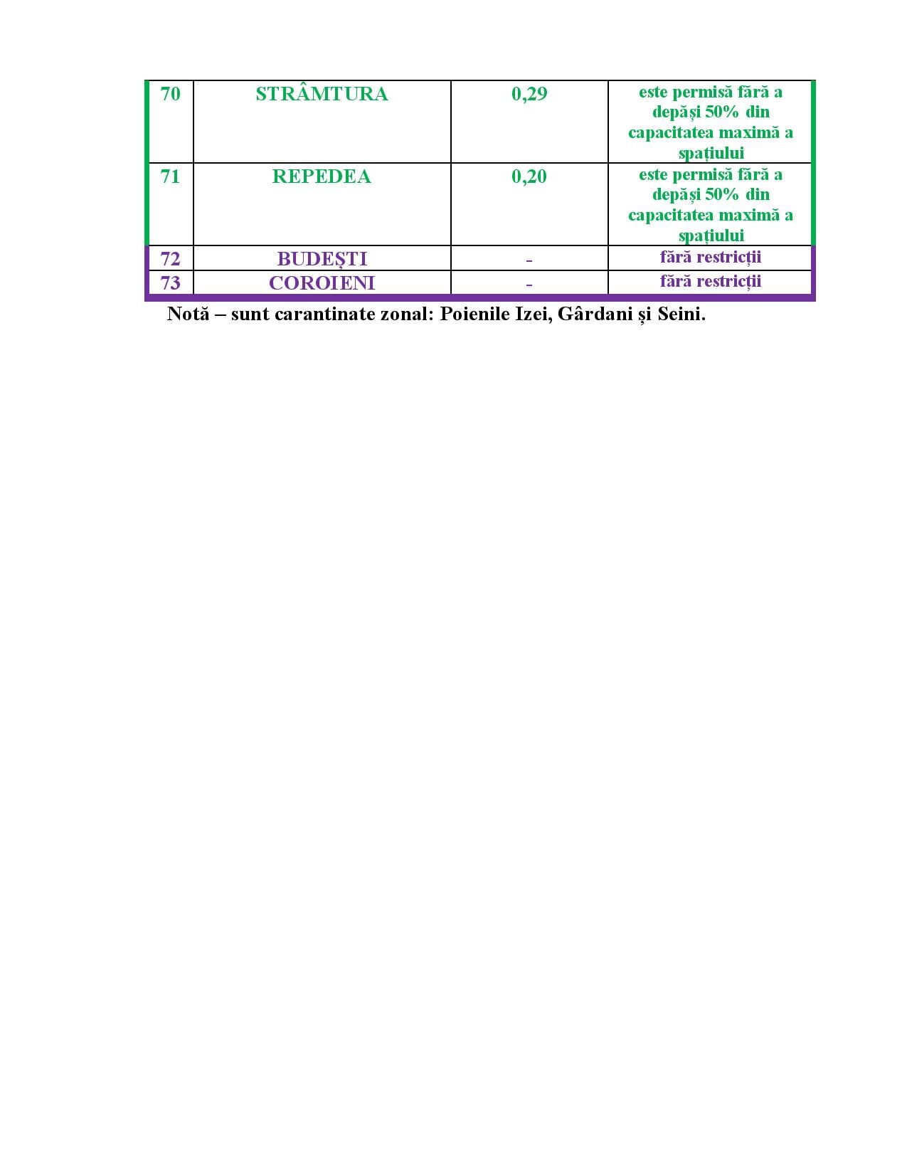 Se interzice activitatea cu publicul a restaurantelor, barurilor și cafenelelor în interiorul clădirilor, în unitățile administrativ-teritoriale unde rata de incidență este mai mare de 3 cazuri la 1000 de locuitori. Acești operatori economici pot prepara hrana și comercializa produse alimentare, băuturi alcoolice și nealcoolice care nu se consumă în spațiile respective, în sistem take-away și catering. Nu se permite activitatea în cluburi și discoteci. Rămân interzise desfășurarea de reuniuni cu prilejul unor sărbători, aniversări, petreceri în spații închise și/sau deschise, publice și/sau private.