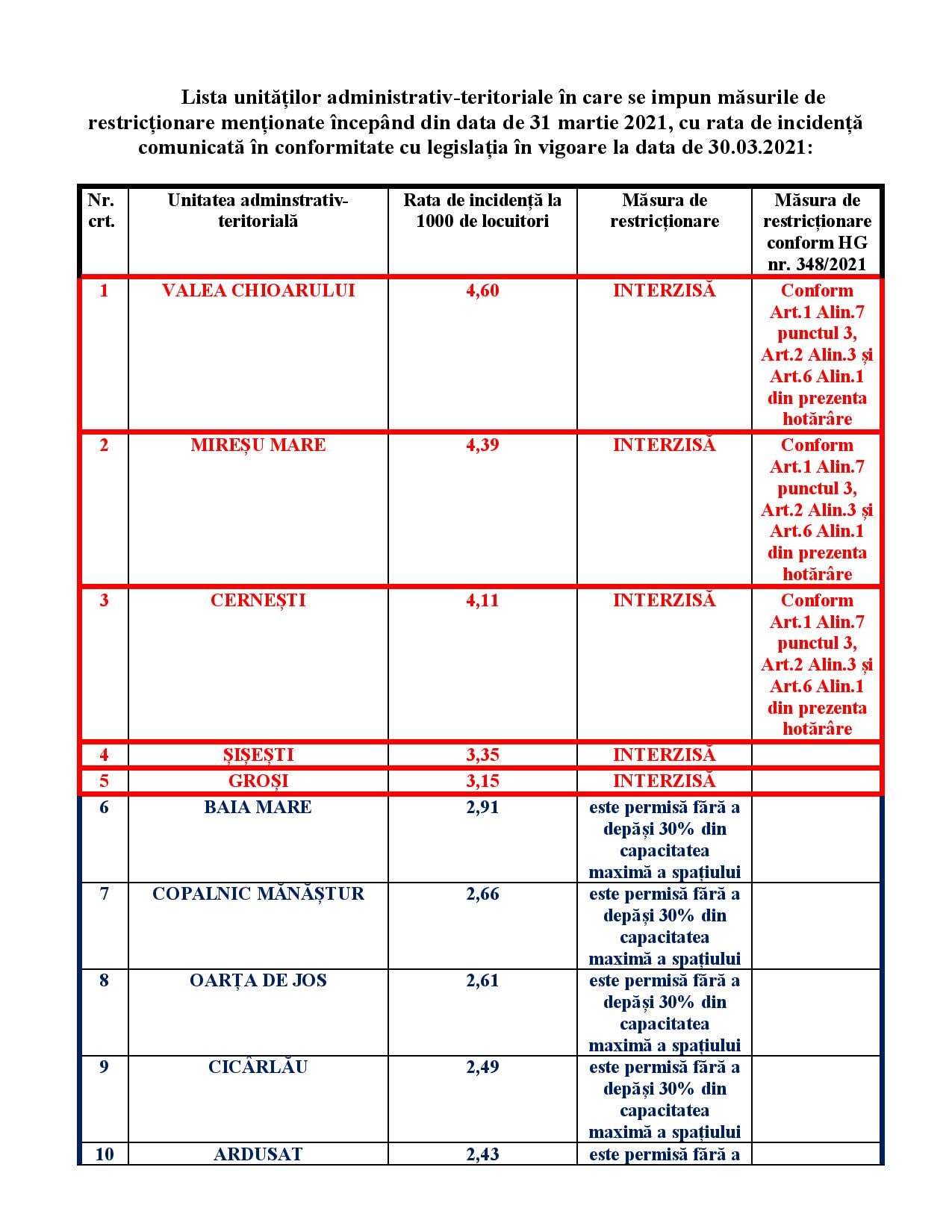 Este cunoscut faptul că una dintre măsuri este închiderea restaurantelor în interior în unitățile administrativ-teritoriale în care incidența cazurilor depășește 3 cazuri de COVID-19 la mia de locuitori. Însă, noile cifrele luate în considerare sunt cele din 30 martie (vezi tabelul la finalul materialului). Municipiul Baia Mare a coborât sub pragul de 3 cazuri de COVID-19 la mia de locuitori.