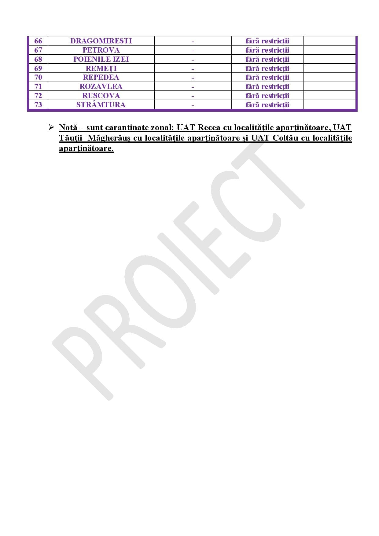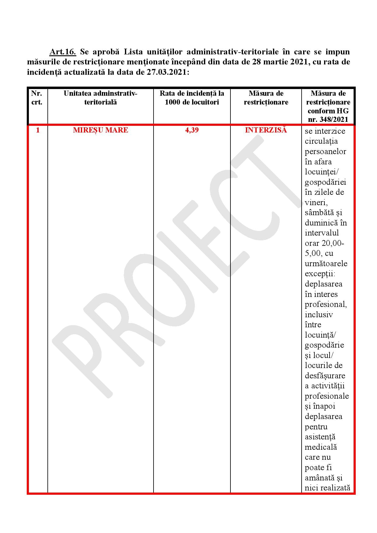 Comitetul Județean pentru Situații de Urgență s-a întrunit duminică în ședință extraordinară, în sistem online, și a aprobat măsurile și regulile care trebuie respectate la nivelul unităților administrativ-teritoriale, inclusiv cele care au intrat în vigoare de aseară, conform Hotărârii de Guvern nr. 348/2021 pentru modificarea și completarea anexei nr. 3 la Hotărârea de Guvern nr. 293/2021 privind prelungirea stării de alertă pe teritoriul României începând cu data de 14 martie 2021, precum și stabilirea măsurilor care se aplică pe durata acesteia pentru prevenirea și combaterea efectelor pandemiei de COVID-19 a precizat președintele CJSU, prefectul Vlad -Emanuel Duruș. Actualizarea s-a realizat în conformitate cu prevederile legislației în vigoare, evoluția situației epidemiologice și rata de incidență comunicată de către Direcția de Sănătate Publică Maramureș. Lista unităților administrativ-teritoriale a fost actualizată cu data de 27 martie 2021.