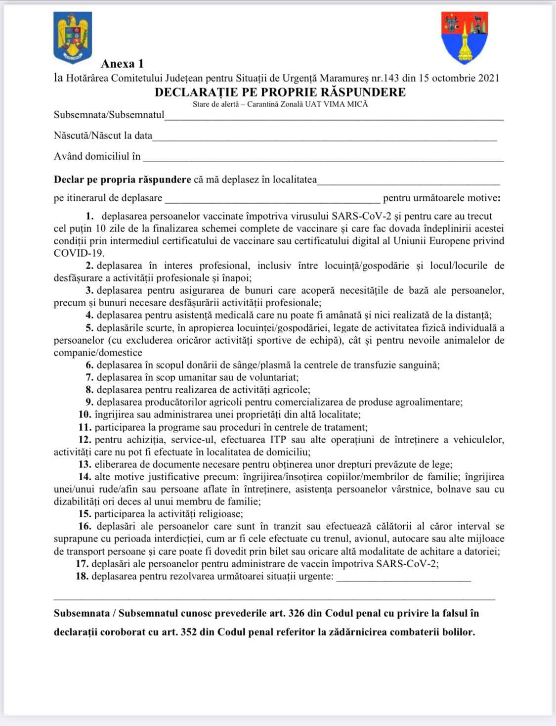 🛑În intervalul orar 5,00-20,00, în comuna ,Vima Mică (sat Vima Mică) se interzice circulația tuturor persoanelor în afara locuinței/gospodăriei, cu următoarele excepții: