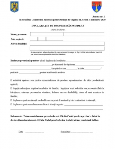Pentru verificarea motivului deplasării în interes profesional, persoanele sunt obligate să prezinte, la cererea personalului autorităților abilitate, legitimația de serviciu, adeverința eliberată de angajator sau o declarație pe propria răspundere. Pentru verificarea motivului deplasării în interes personal, persoanele sunt obligate să prezinte, la cererea personalului autorităților abilitate, o declarație pe proprie răspundere, completată în prealabil. Declarația pe propria răspundere trebuie să cuprindă numele și prenumele, data nașterii, adresa locuinței/gospodăriei/locului activității profesionale, motivul deplasării, data completării și semnătura. O altă măsură instituie obligația pentru operatorii economici care desfășoară activități de comerț/prestări de servicii în spații închise și/sau deschise, publice și/sau private să-și organizeze și desfășoare activitatea în intervalul orar 05.00 – 21.00. Prin excepție de la această măsură, unitățile farmaceutice, benzinăriile și operatorii economici cu activitate de livrare la domiciliu își pot desfășura activitatea în regim normal de muncă, cu respectarea normelor de protecție sanitară. În intervalul ora 21.00 – 5.00 operatorii economici pot activa doar în relația cu operatorii economici cu activitate de livrare la domiciliu.