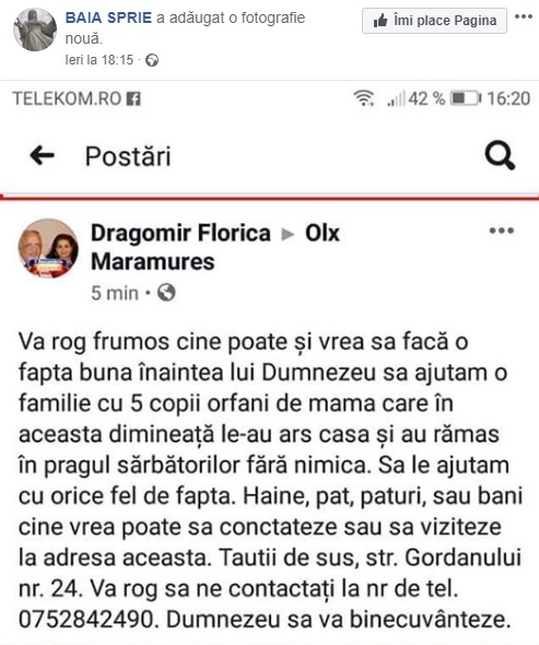 ”În Tăuții de Sus a luat foc acoperișul unei case. Au fost distruși 10 mp de acoperiș din lemn și 4 mp de tavan din rigips” – a comunicat ISU Maramureș. Florica Dragomir a mai adăugat date despre acest incendiu. ” Să ajutăm o familie cu 5 copii orfani de mamă, cărora le-a ars casa și au rămas în pragul sărbătorilor fără nimica. Haine, pat, paturi sau bani, cine vrea poate să contacteze la adresa aceasta: str. Gordanului, nr, 24, Tăuții de Sus. Vă rog să ne contactați la nr. de telefon 0752842490. Dumnezeu să vă binecuvânteze” – scrie Florica, într-un anunuț posta pe platforma OLX.
