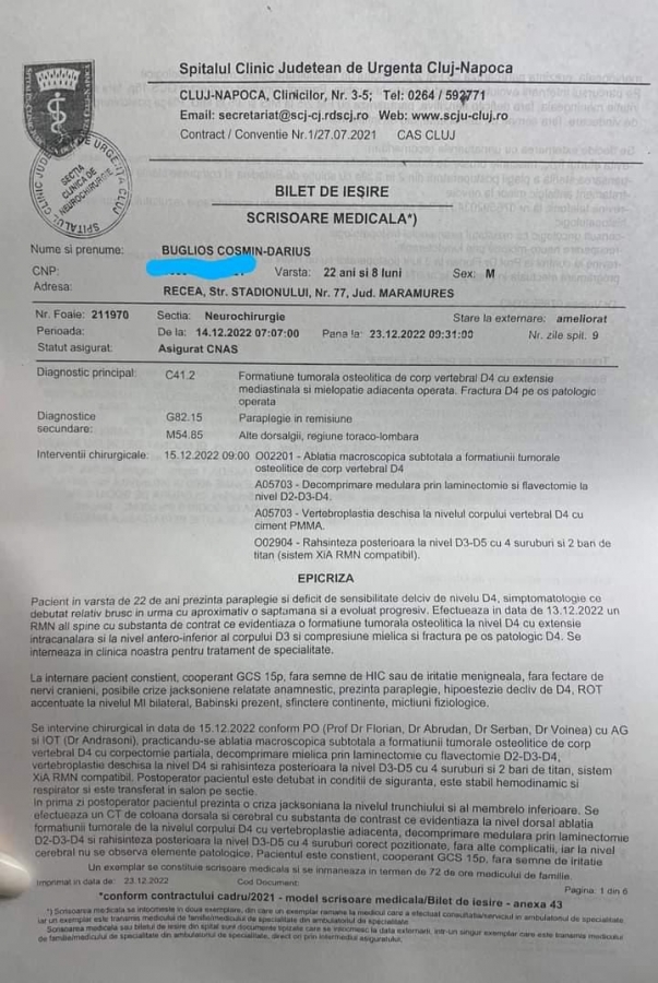 Dânsul ne-a transmis gravitatea situației și ne-a chemat urgent la Cluj pentru operație, diagnosticul fiind “Tumoră osoasă cu celule gigantice”. Ne-a asigurat că va face tot posibilul ca operația să fie o reușită.