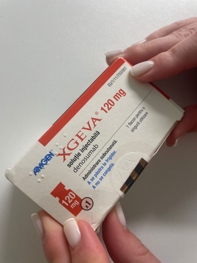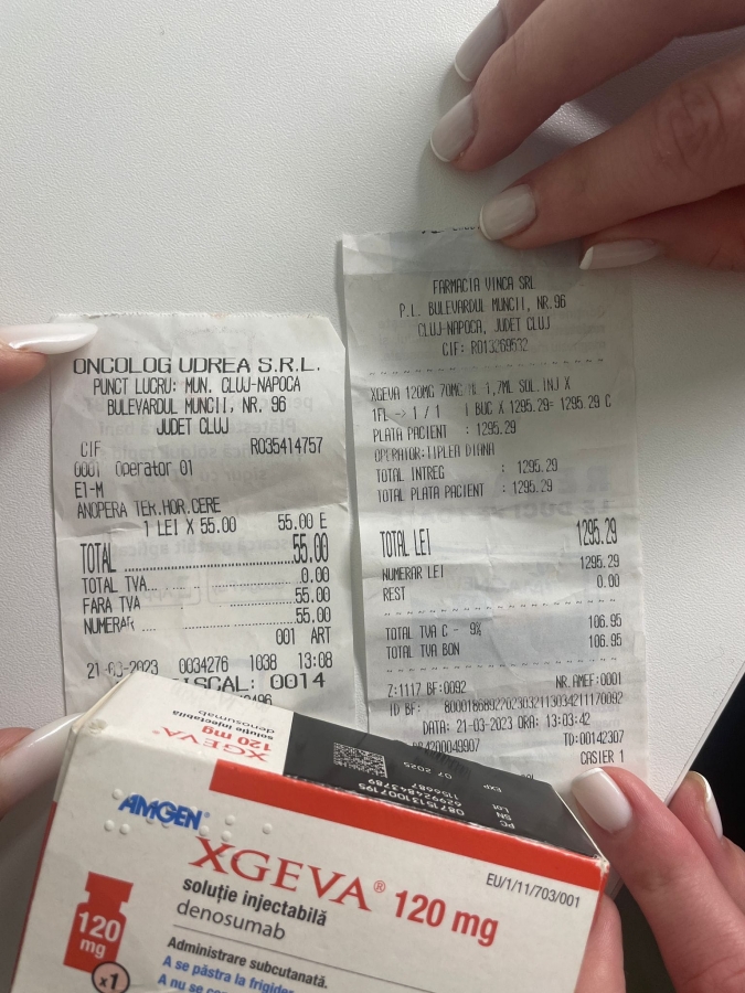 Din păcate, Denosumab nu este decontat de către Casa de Asigurări de Sănătate. Trebuie să merg lunar la Cluj pentru analize și pentru administrarea injecției. Costul serului este de 1300 RON, așa cum puteți observa în fotografiile atașate. Pentru că sunt doar cu mama acum, această sumă este suficient de mare încât, având în vedere veniturile noastre limitate, să reprezinte un efort financiar pe care nu ni-l putem permite. Mama este singura care lucrează, întrucât eu urmează să primesc pensie de boală.