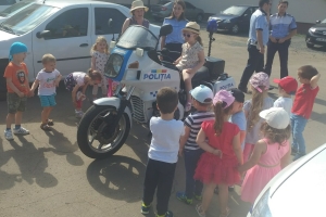Octavia, o fetiță de la Grădiniţa de Arte din Baia Mare, a împlinit azi, 12 iunie, 4 ani. Și-a dorit să-și sărbătorească ziua în mijlocul polițitilor. Așa încât, însoţită de doamna educatoare şi colegi, a fost primită cu drag la Inspectoratul de Poliţie al Judeţului (IPJ) Maramureş. Înainte de a gusta din tortul pregătit pentru aniversarea ei, micuții au mâncat cireșe culese din curtea inspectoratului de mascaţi, au discutat cu poliţiştii de prevenire despre ce trebuie să facă pentru siguranţa lor pe drumurile publice, acasă, la locurile de joacă și în vacanţă. Preșcolarii au putut testa şi motocicleta din dotarea Biroului Rutier Baia Mare, iar ziua s-a încheiat cu zâmbete provocate de cei mai tineri câini poliţişti, însoțiți de conductorii Grupei Canine şi de explicaţiile oferite de aceștia.