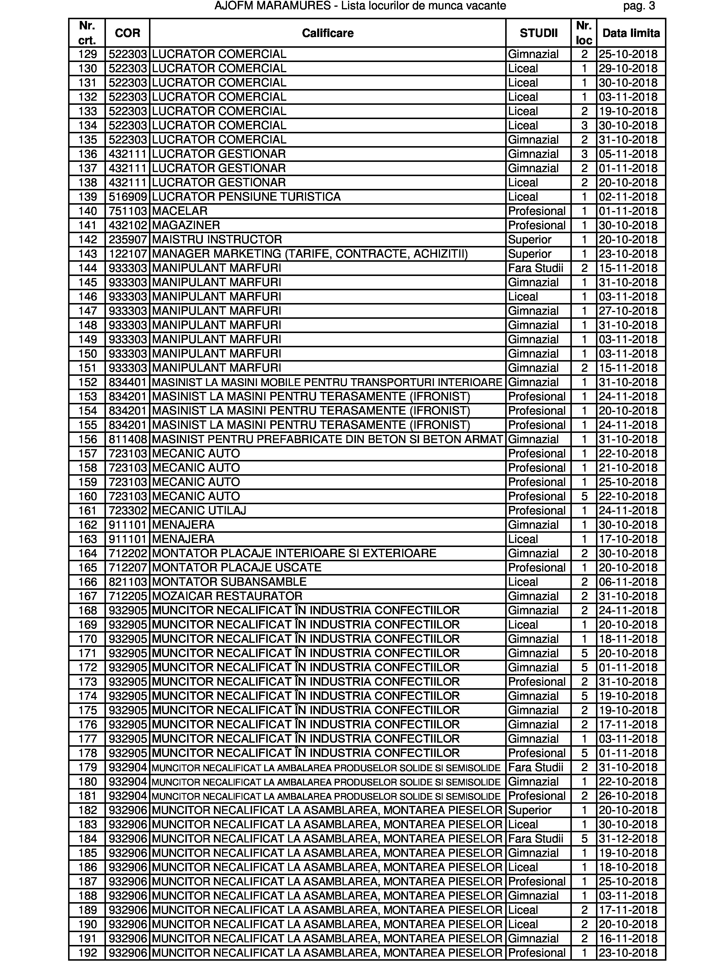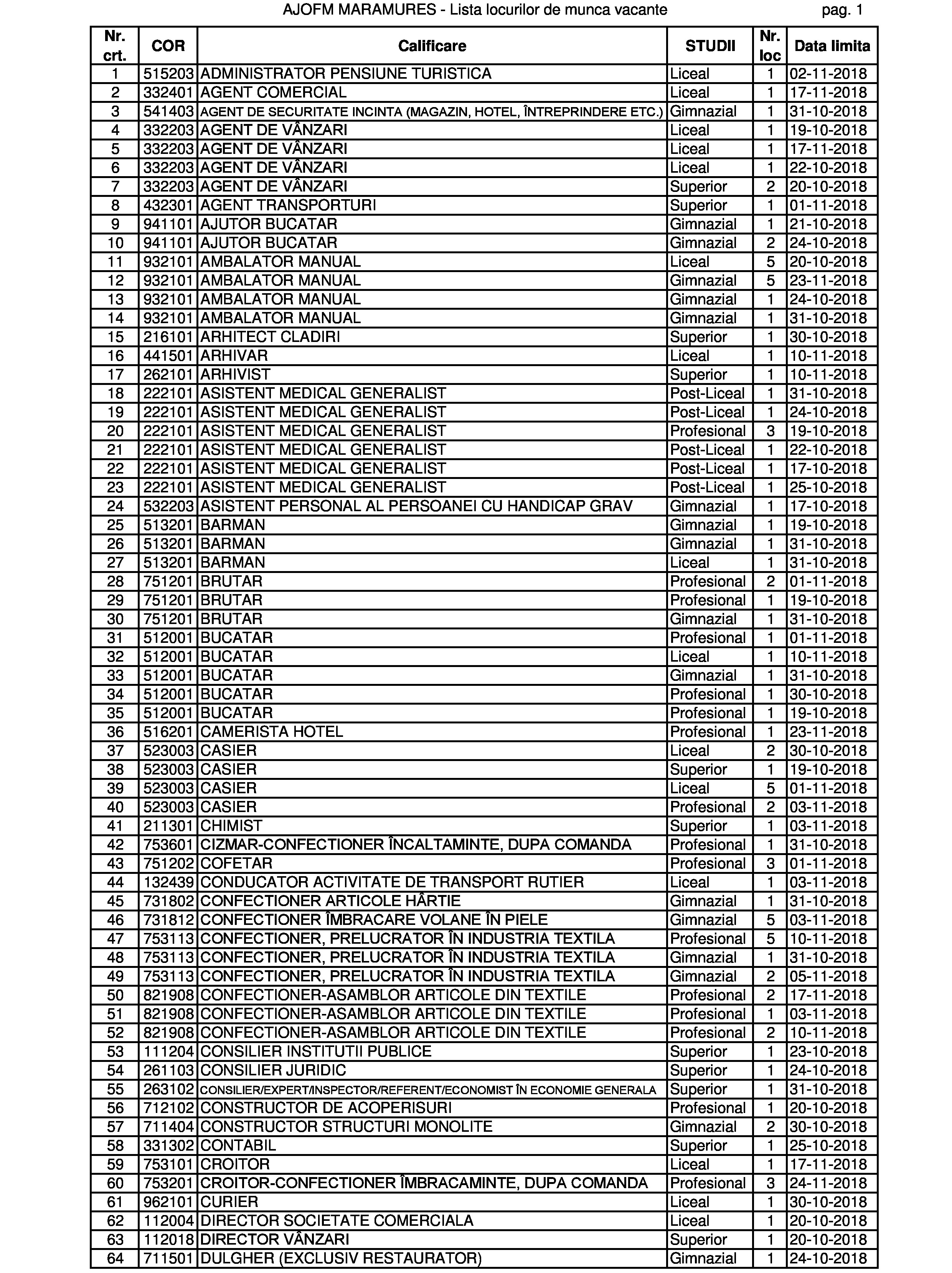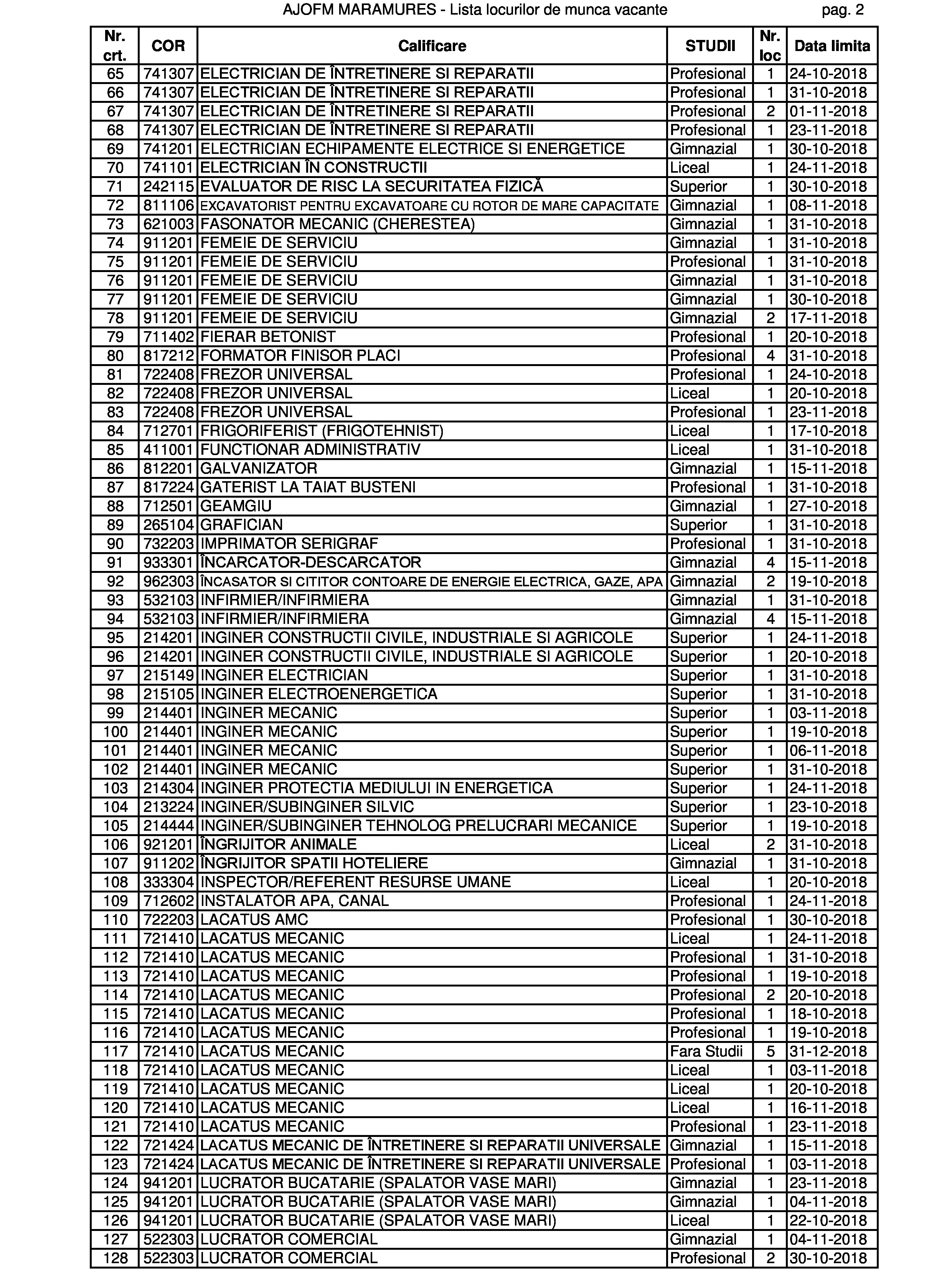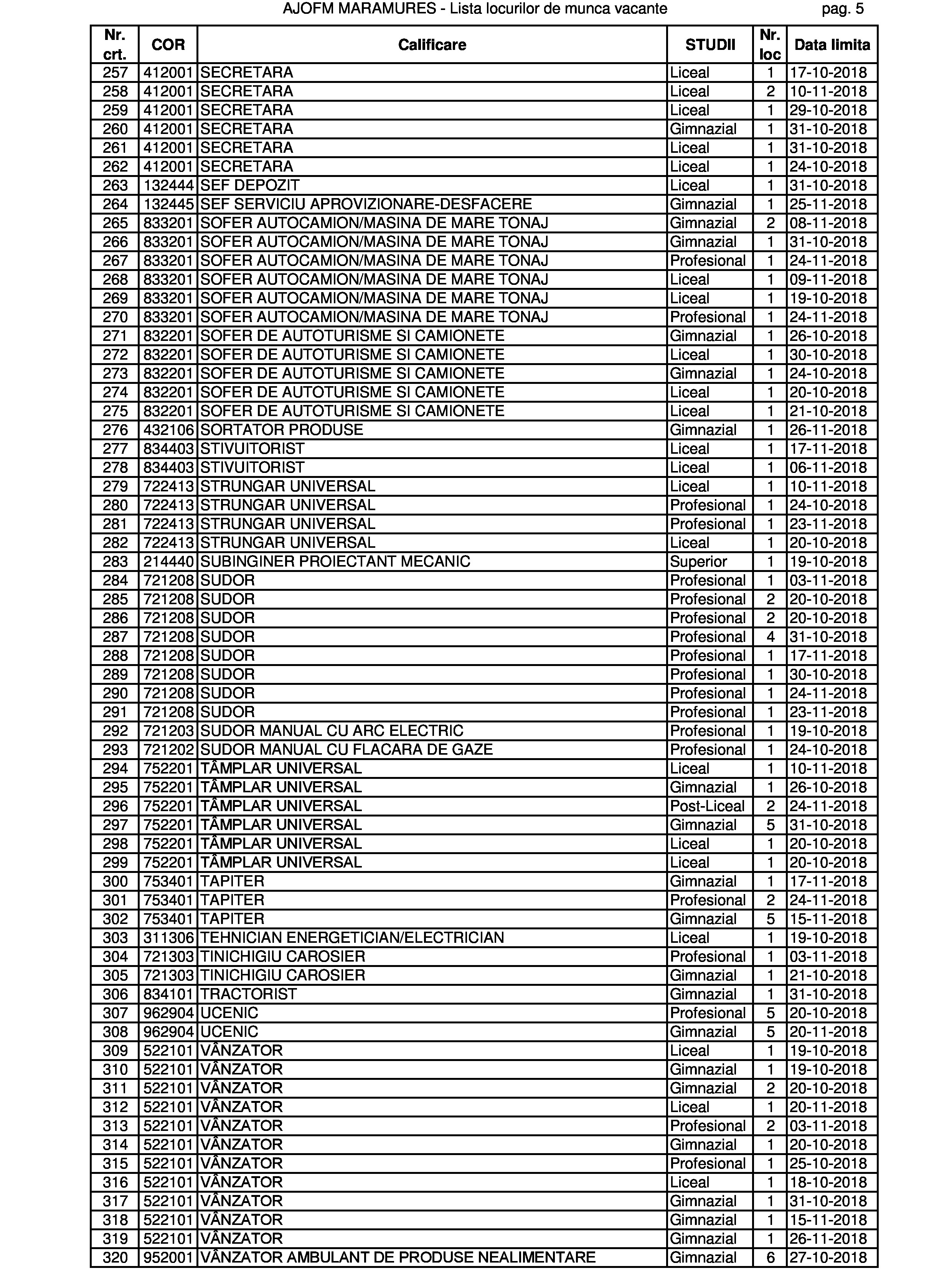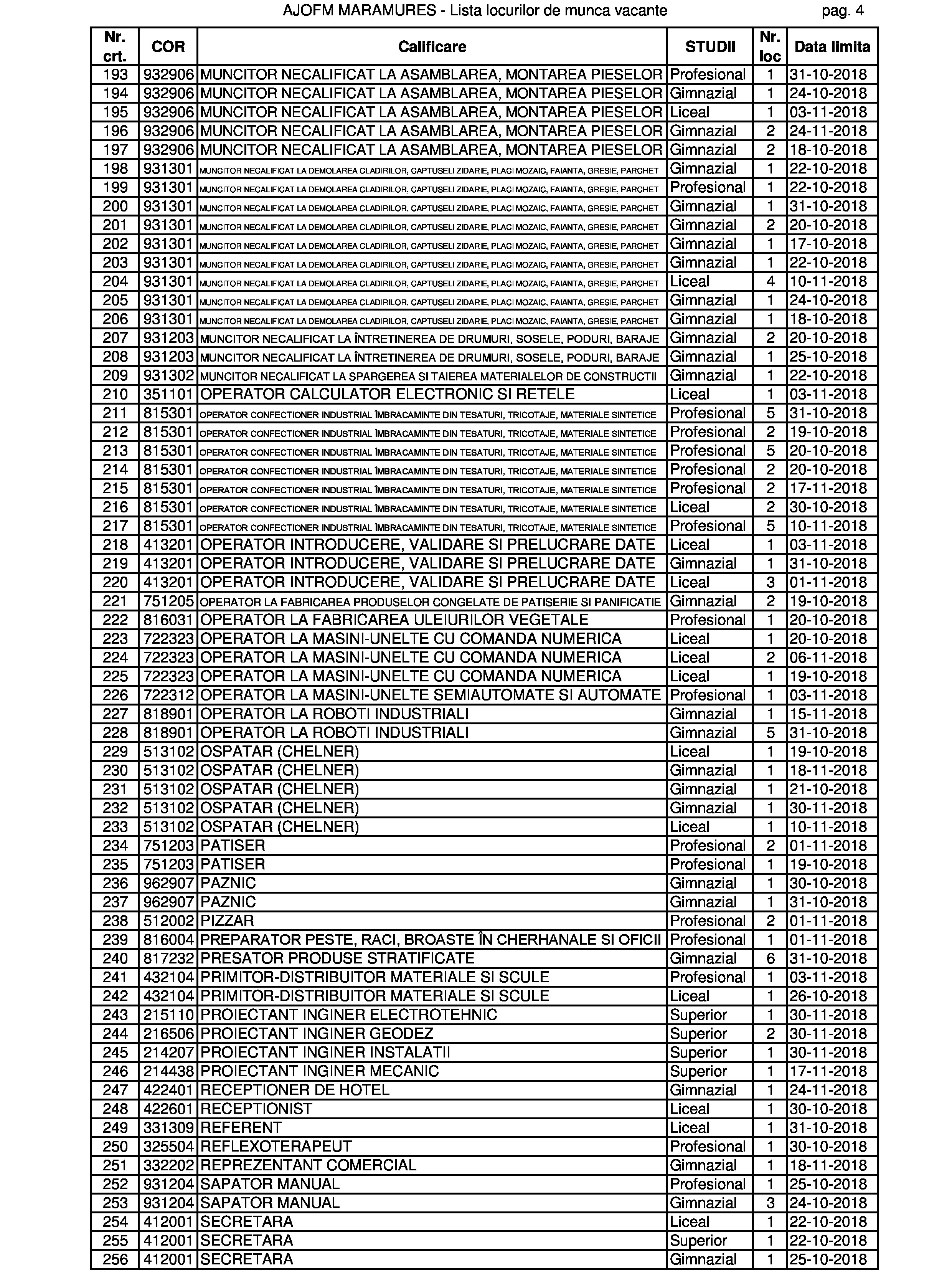 Numărul locurilor de muncă vacante din județul Maramureș a depășit acum pragul de 500. Au apărut oferte și pentru meserii tradiționale: ”geamgiu” și ”cizmar-confecționer pentru încălțăminte la comandă”. Dar și unele din noua gardă: ”evaluator risc la securitate fizică” și ”reflexoterapeut”. Ori din garda veche, dar cu extensie nouă: ”preparator pește, raci, broaște în cherhanale sau oficii”. Cu liceul poți ocupa și un post de director societate comercială, dar și unul de îngrijitor de animale. Există și un post de secretară la care se solicită în mod expres studii superioare. Dar vă lăsăm pe dvs. să studiați oferta în clar.