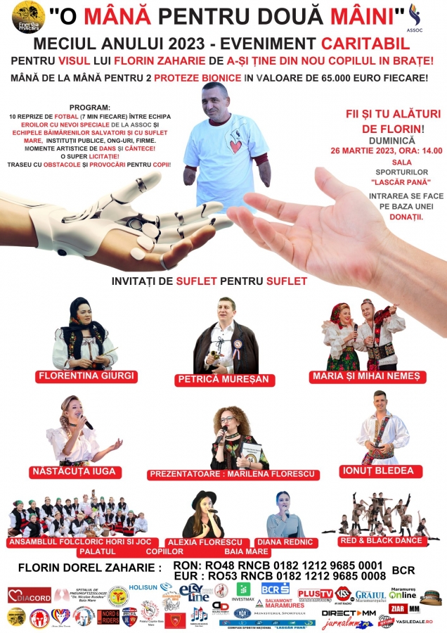 Duminică, 26 martie, de la ora 14.00, Sala Sporturilor „Lascăr Pană” din Baia Mare va găzdui evenimentul caritabil „Mână pentru două mâini – Meciul anului 2023 pentru visul lui Florin Zaharie de a-și ține din nou copilul în brațe”.