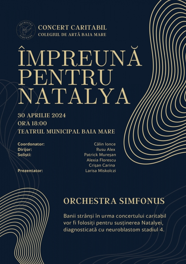 Marți, 30 aprilie, de la ora 18:00, la Teatrul Municipal Baia Mare va avea loc concertul caritabil “Împreună pentru Natalya”, susținut de Orchestra Simfonus și soliștii Alexia Florescu, Carina Crișan și Patrick Mureșan din cadrul Colegiului de Arte Baia Mare – coordonator Călin Ionce, dirijor Alex Rusu, prezentator actrița Miskolczi Larisa .