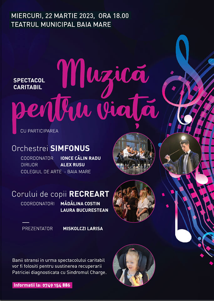 Miercuri, 22 martie, de la ora 18.00, sala mare a Teatrului Municipal Baia Mare va găzdui un concert caritabil, scopul fiind strângerea de fonduri pentru susținerea recuperării Patriciei, o fetiță din Maramureș diagnostitcată cu Sindromul Charge.