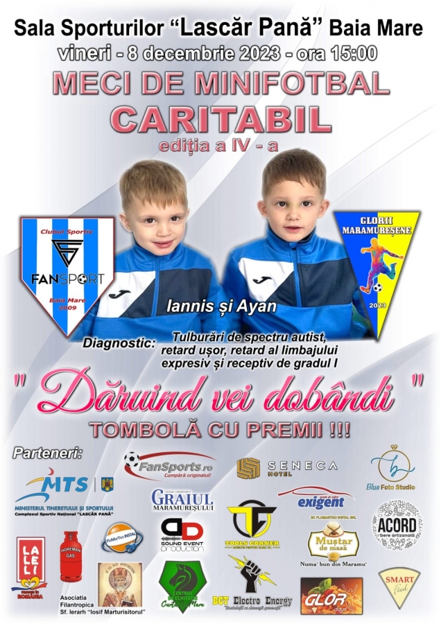 Echipele Fan Sport Baia Mare și Glorii Maramureșene vor să-i sprijine pe Iannis și Ayan, doi frățiori diagnosticați cu tulburări de spectru autist, retard ușor, retard al limbajului expresiv și receptiv de gradul 1. Ei au nevoie de îngrijire și educație specială.