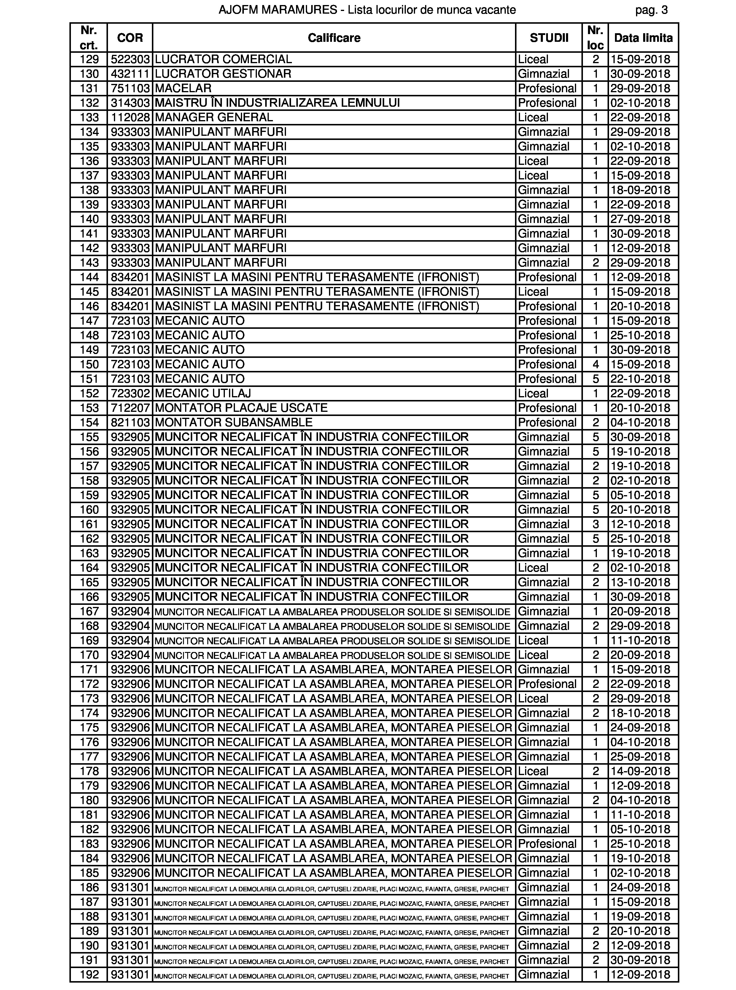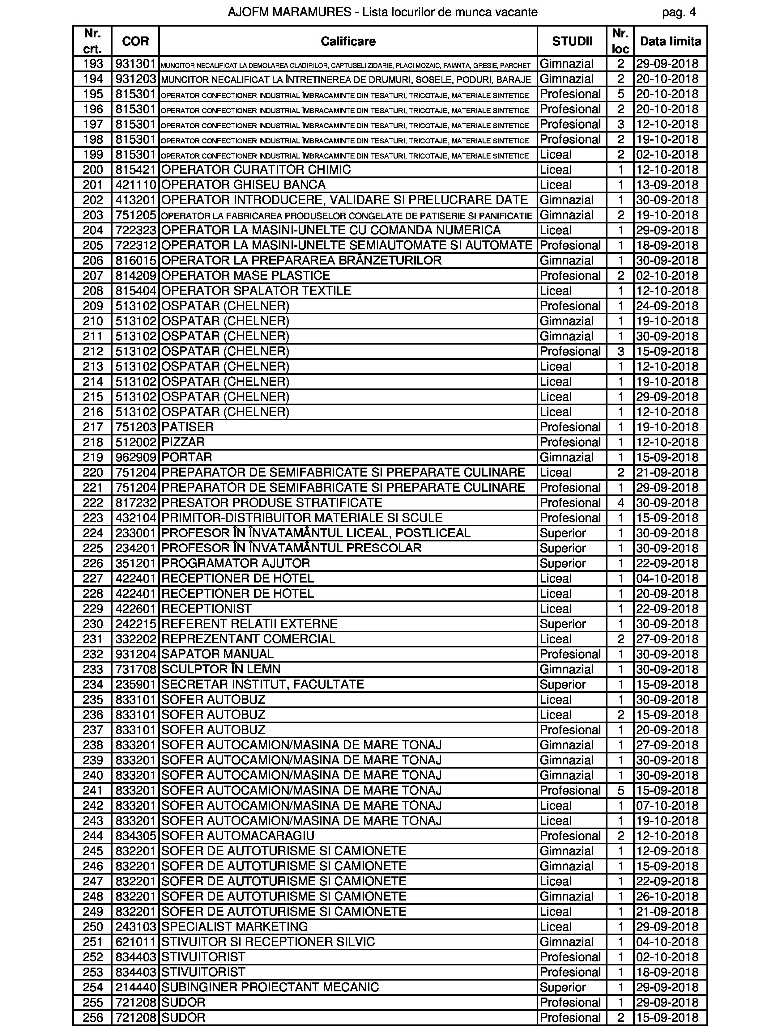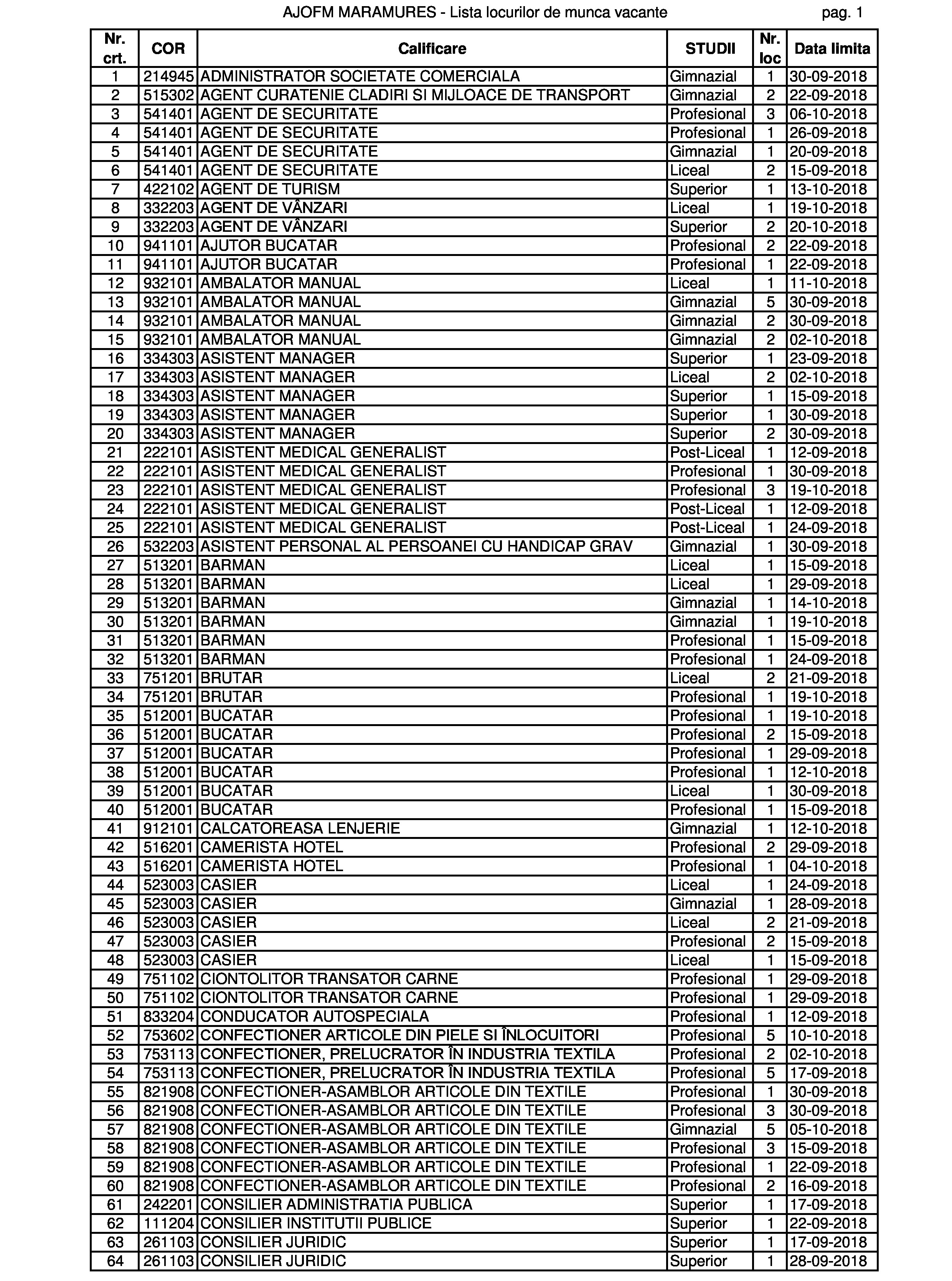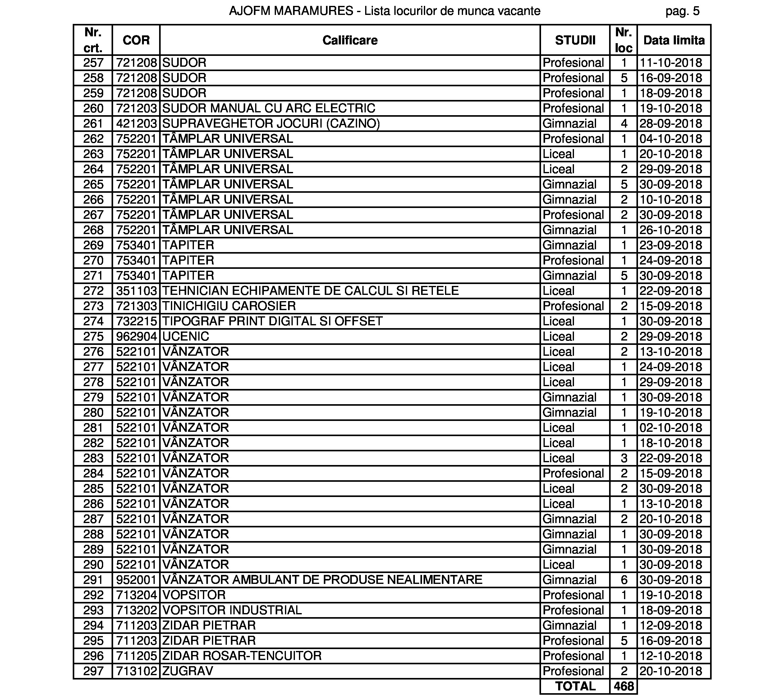 468 de locuri de muncă oferă în această săptămână AJOFM Maramureș. Printre ele sunt și câteva interesante. De pildă, există unpost de administrator societate comercială pentru care se solicită doar studii gimnaziale. Puteți fi director de societate comercială sau manager general chiar dacă ați absolvit doar liceul. Este adevărat că există și un post de fierar betonist pentru care e se solicită aceleași studii ca la directori: liceul. E adevărat că în cazul celorlalte posturi de fierar betonist se cer doar studii profesionale. Dar iată lista completă a locurilor de muncă într-un format foarte ușor de parcurs.