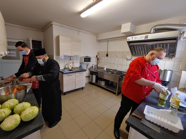 Părintele Arhimandrit Casian Filip, responsabilul Sectorului Social-Filantropic și Misionar al Episcopiei Maramureșului, a gătit joi, 11 martie, în bucătăria Asociației „O masă caldă” din Satu Mare, pentru beneficiarii Adăpostului de Noapte din oraș. Părintele nu a venit cu mâna goală, ci a adus și o donație în alimente neperisabile.
