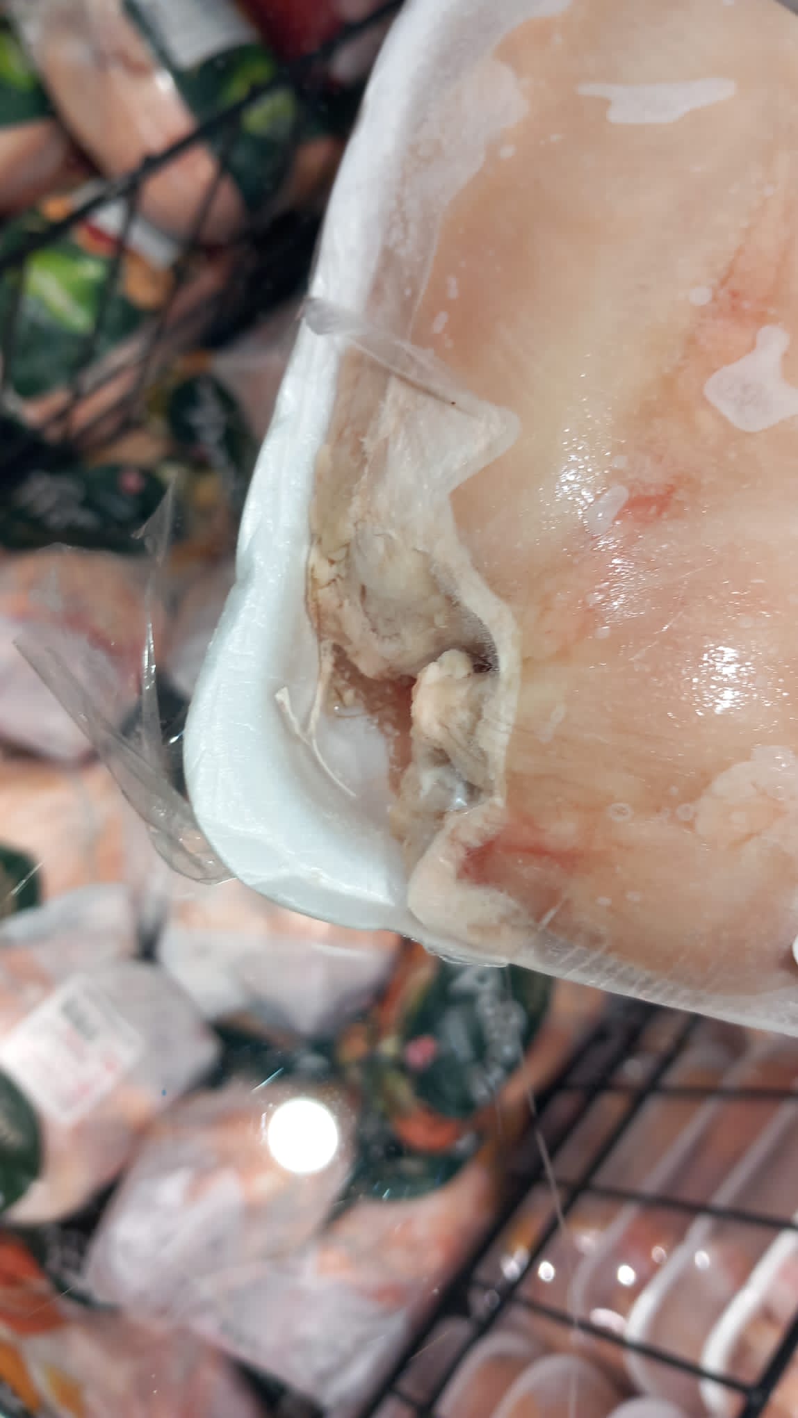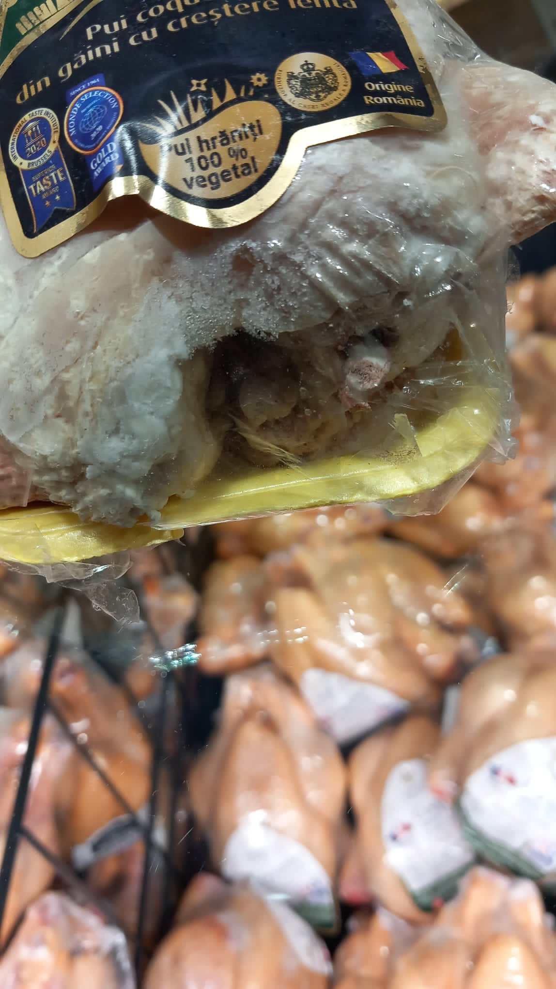 - comercializare produse congelate (carne de pui, ficat, pulpe pui, etc) cu ambalaj deteriorat/cu arsuri de decongelare