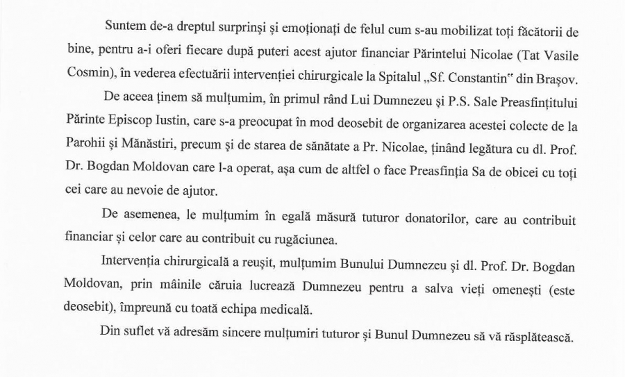 Azi venim cu o veste bună. Suma s-a strâns, părintele a fost operat, procedura decurgând bine. Maica stareță împreună cu obștea mulțumesc tuturor pentru sprijin. Redăm mesajul integral:
