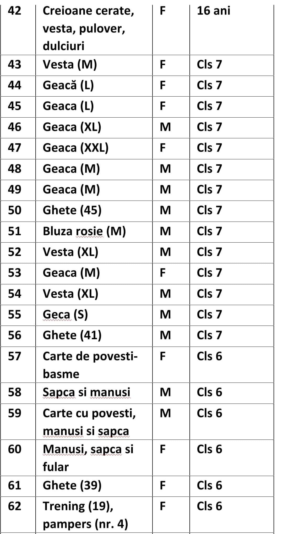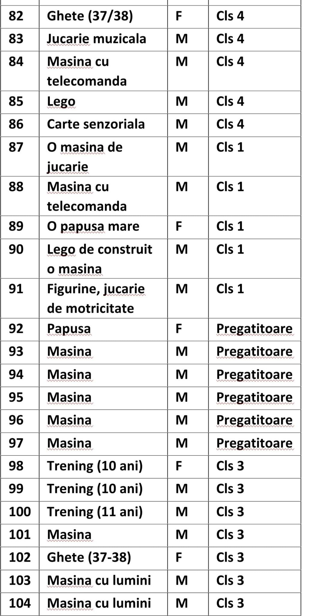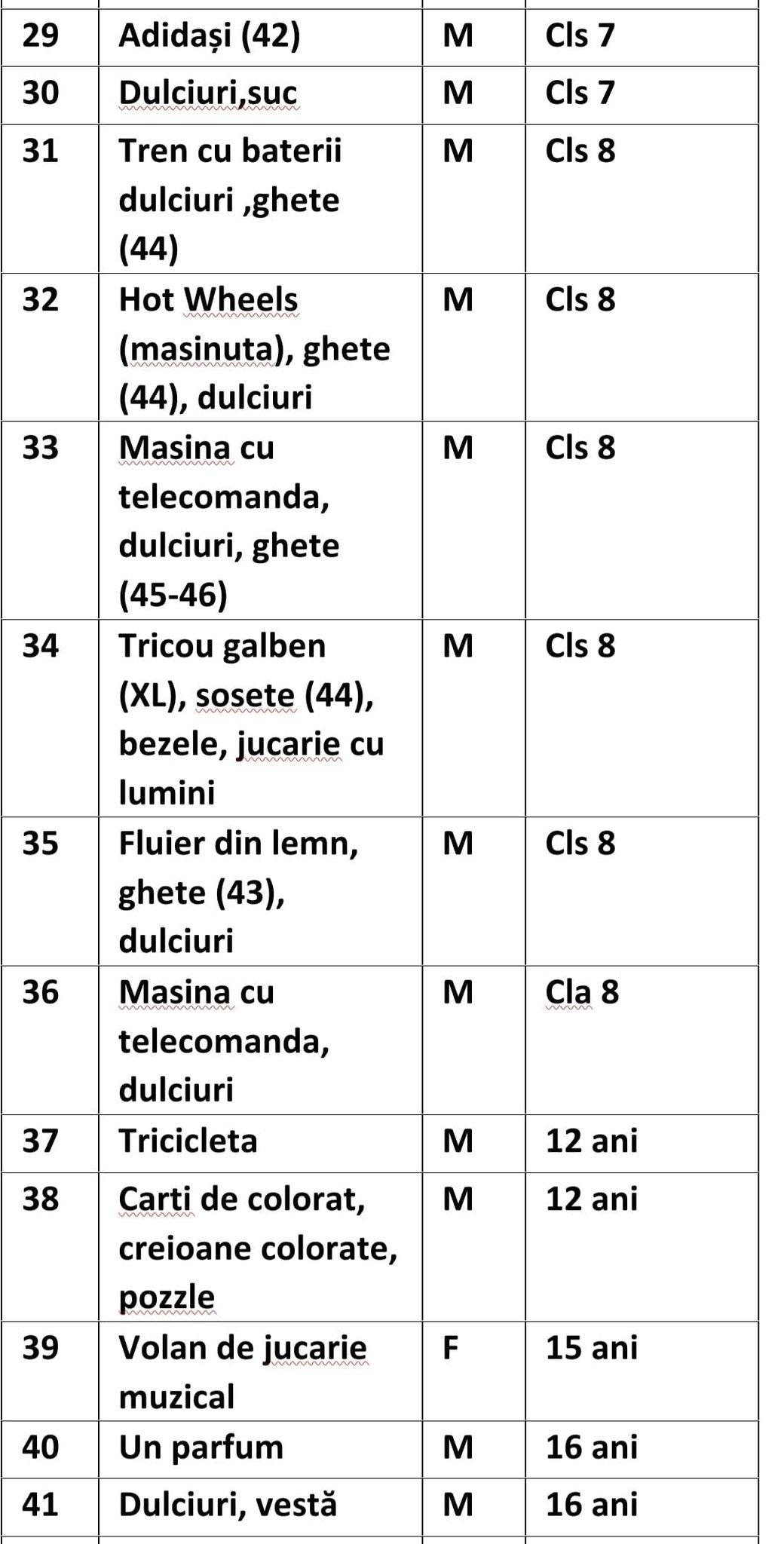 „Am inițiat acest proiect în 2012. Organizăm cam trei ediții pe an. Motivația proiectului este să ajutăm cât mai multe persoane. O țintă dorită de noi este să aducem aproape de noi absolvenții de LTM alături de elevii de acum, dar și cei care doresc să ajute, aproape de noi și dacă vor să fie aproape de mine și de noi, arătând, astfel, că sunt aproape de liceul în care au învățat, este și mai bine. Și am cam reușit ceea ce ne-am propus în edițiile anterioare ale campaniei. Zâmbetele celor care primesc darurile sunt unice și sincere, indiferent ce primesc. Dar noi, anul acesta am dorit să fim mai atenți și să încercăm să le aducem exact ceea ce își doresc punctual”, arată pentru DirectMM.ro Adriana Ioana Vescan, directorul LTM. Iată lista completă atașată! DirectMM.ro este partener media oficial al campaniei Liceului Tehnologic Marmația! Vom reveni cu articole despre acest subiect! UN DAR ÎNSEAMNĂ FERICIRE!