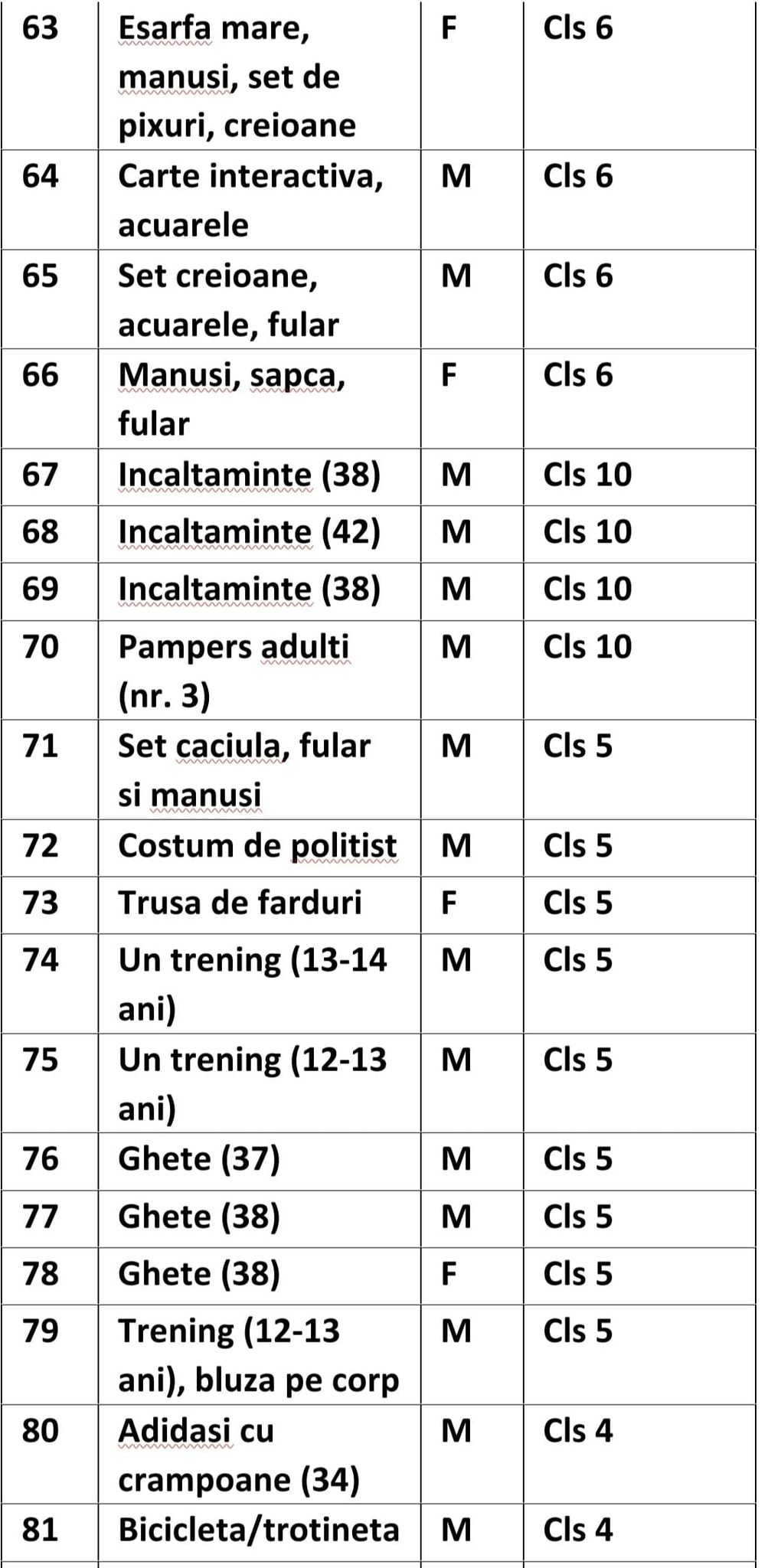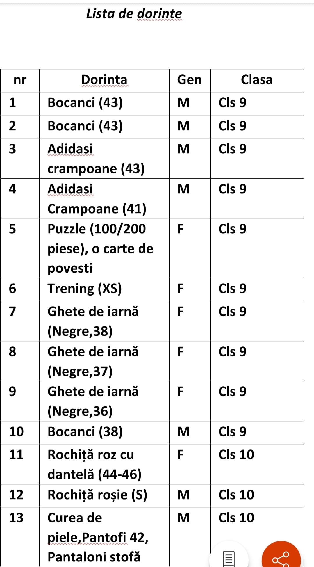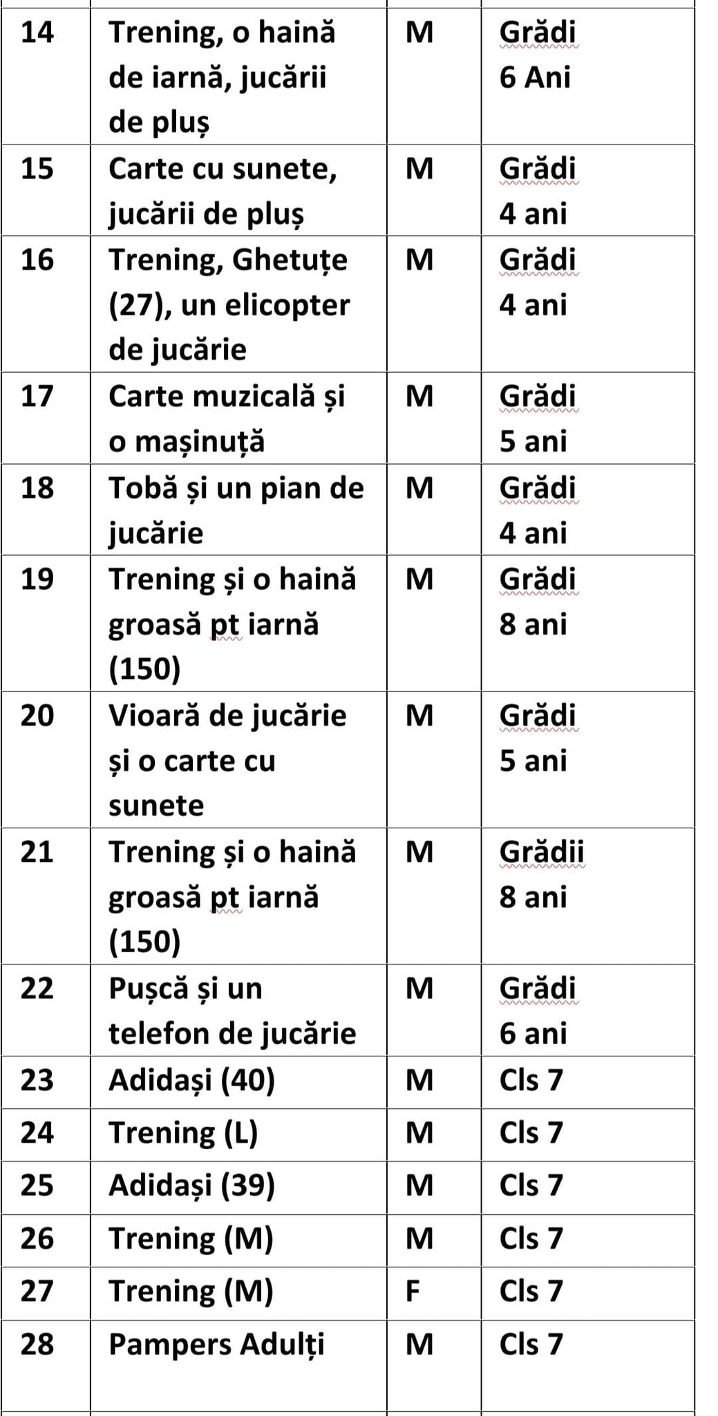„Am inițiat acest proiect în 2012. Organizăm cam trei ediții pe an. Motivația proiectului este să ajutăm cât mai multe persoane. O țintă dorită de noi este să aducem aproape de noi absolvenții de LTM alături de elevii de acum, dar și cei care doresc să ajute, aproape de noi și dacă vor să fie aproape de mine și de noi, arătând, astfel, că sunt aproape de liceul în care au învățat, este și mai bine. Și am cam reușit ceea ce ne-am propus în edițiile anterioare ale campaniei. Zâmbetele celor care primesc darurile sunt unice și sincere, indiferent ce primesc. Dar noi, anul acesta am dorit să fim mai atenți și să încercăm să le aducem exact ceea ce își doresc punctual”, arată pentru DirectMM.ro Adriana Ioana Vescan, directorul LTM. Iată lista completă atașată! DirectMM.ro este partener media oficial al campaniei Liceului Tehnologic Marmația! Vom reveni cu articole despre acest subiect! UN DAR ÎNSEAMNĂ FERICIRE!