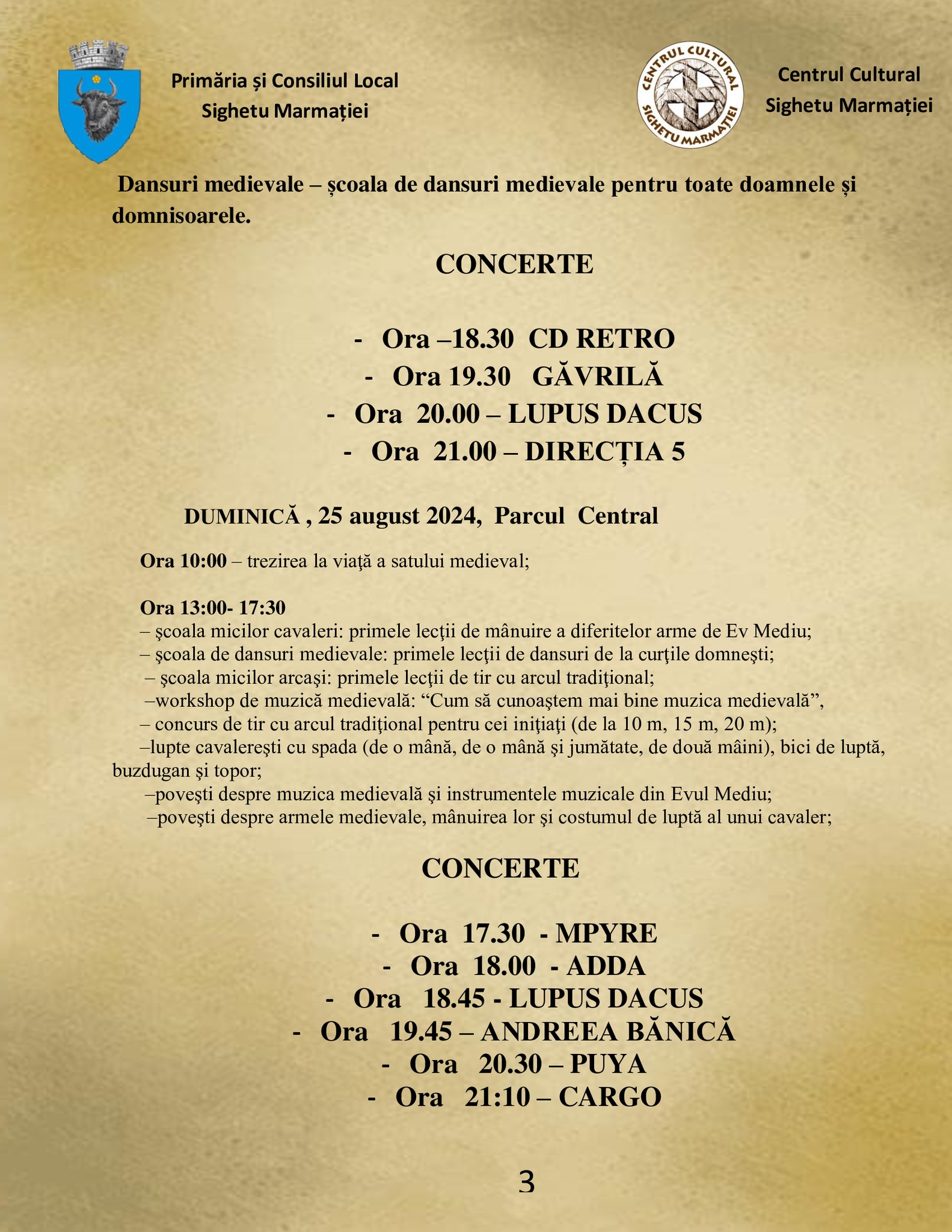 În perioada 24-25 august, Parcul Central din Sighetu Marmației va găzdui cea de-a XIII-a ediție a Festivalul Medieval „Eternul Maramureș”. Anul acesta se împlinesc 698 de ani de la prima atestare documentară a municipiului.